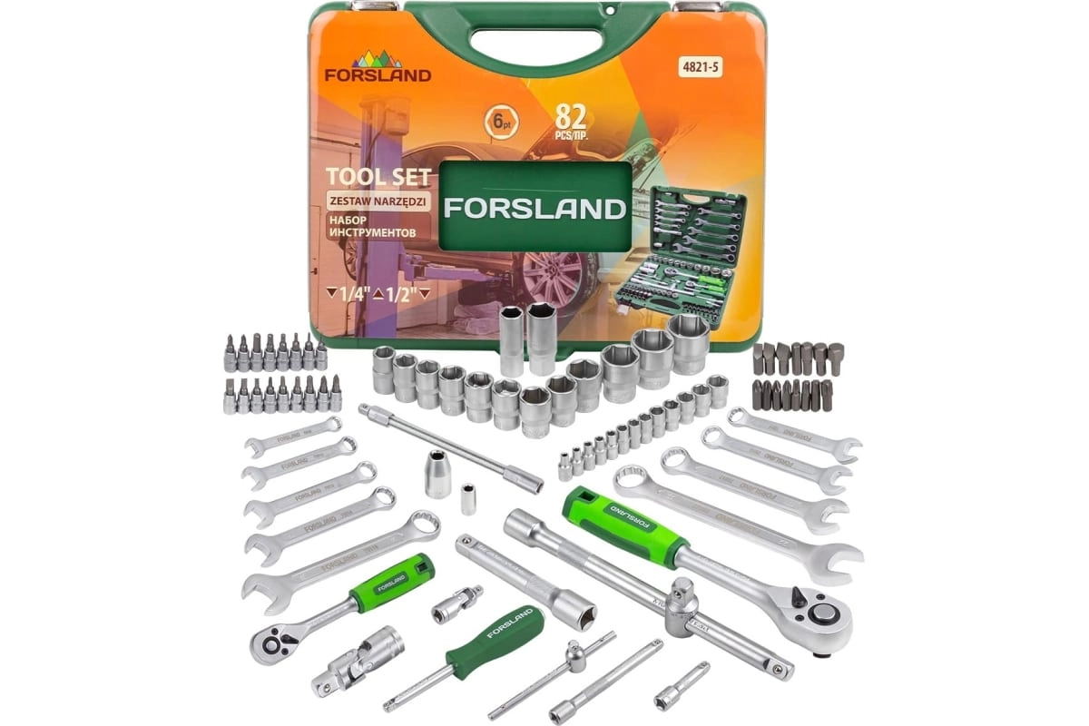 Набор инструментов 82пр. 1/4'', 1/2''(6гр.) (4-32мм) Forsland Forsland-4821-5 - универсальное решение для ремонта автомобилей, дома и дачи. Включает 82 предмета, удобен как для профессиональных механиков, так и для домашних ремонтов.