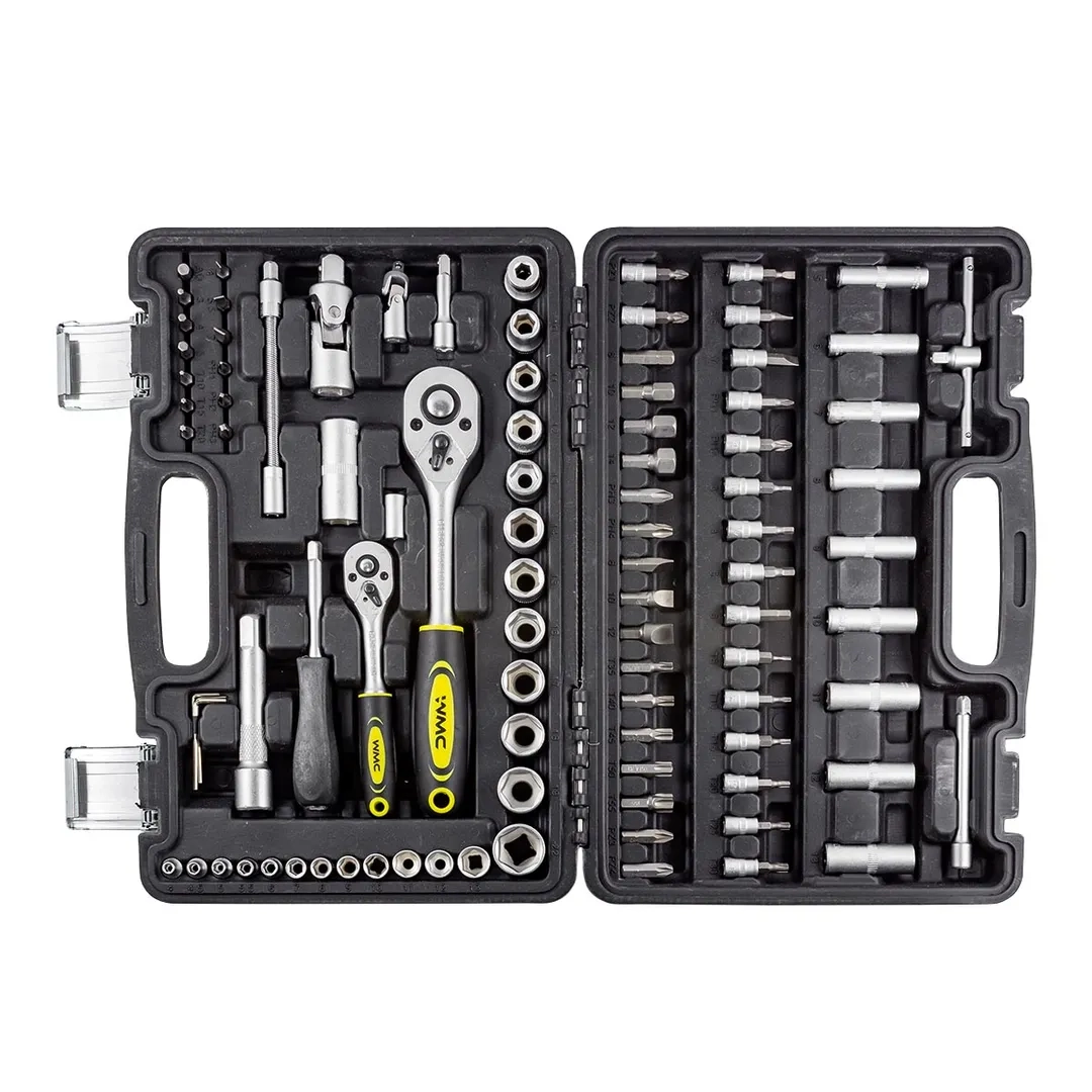 Инструменты WMC TOOLS для ремонтных работ в кейсе с набором головок 1/4", головок-бит, трещоткой, удлинителем, воротком, карданом и другими инструментами. Универсальный набор инструментов для выполнения слесарных, ремонтных, монтажных работ. Набор автомобилиста имеет ряд преимуществ, которые позволяют значительно облегчить выполнение работ при обслуживании и ремонте автомобиля. Все 94 предмета набора инструментов WMC tools упакованы в пластиковый кейс, где у каждого предмета своя ячейка хранения, в котором они прочно крепятся. Материал инструментов - хромованадиевая сталь, что значительно улучшает качество и надежность инструментов. Состоит комплект инструментов для авто из головок различных размеров и форм, бит до удлинителей и шестигранных ключей. Такой набор будет хорошим подарком для профессионалов и любителей!