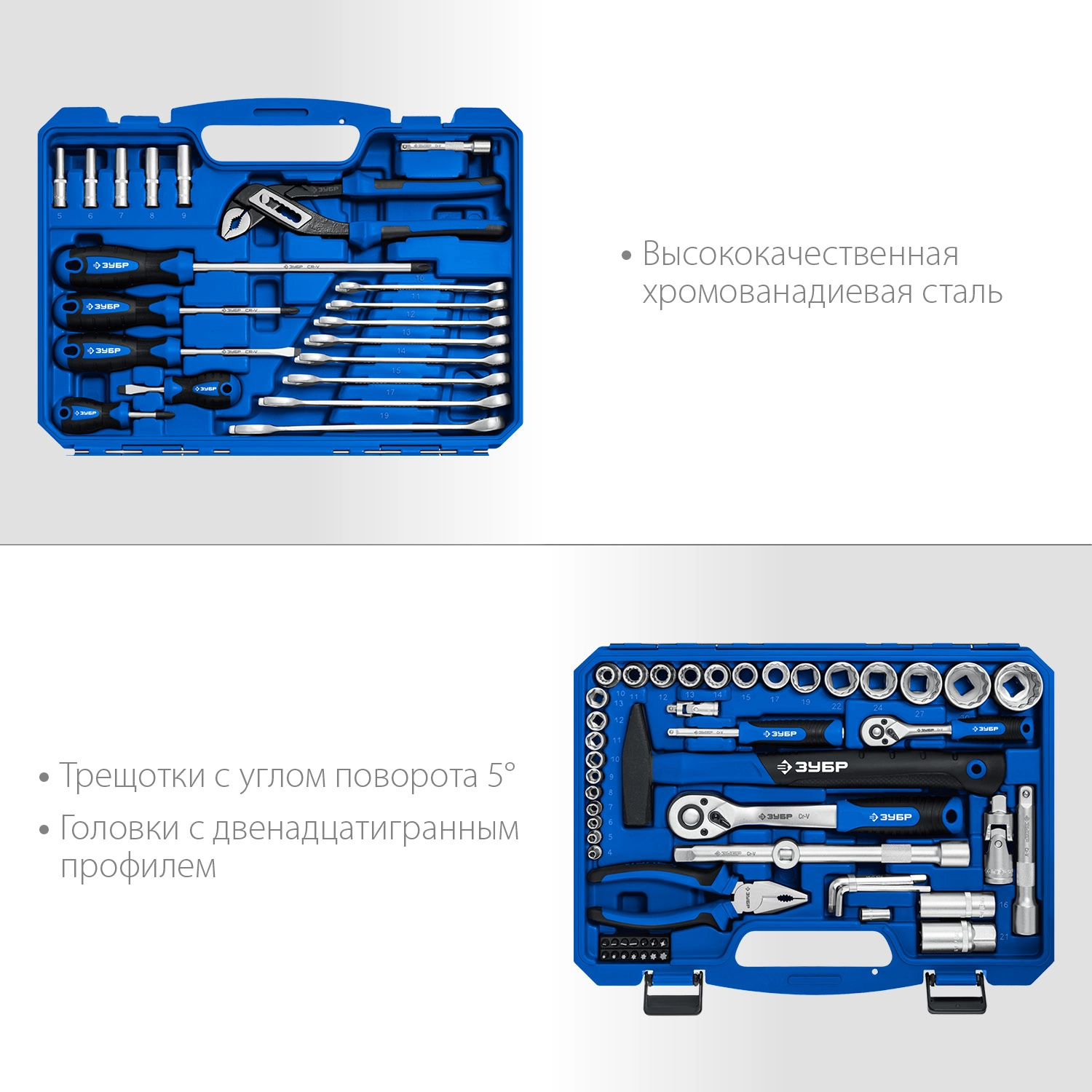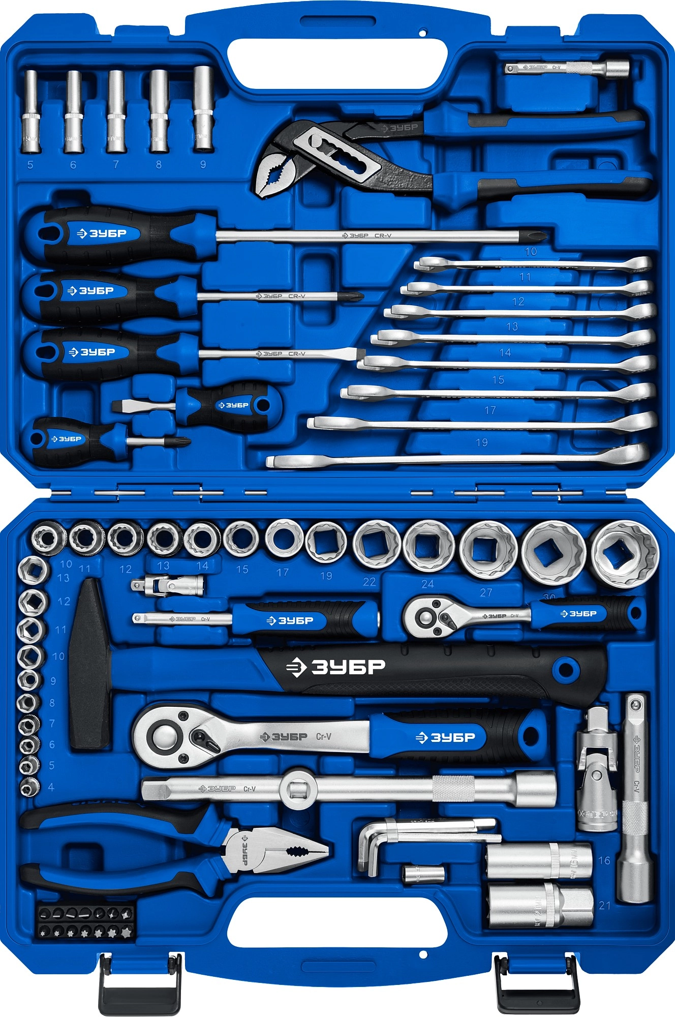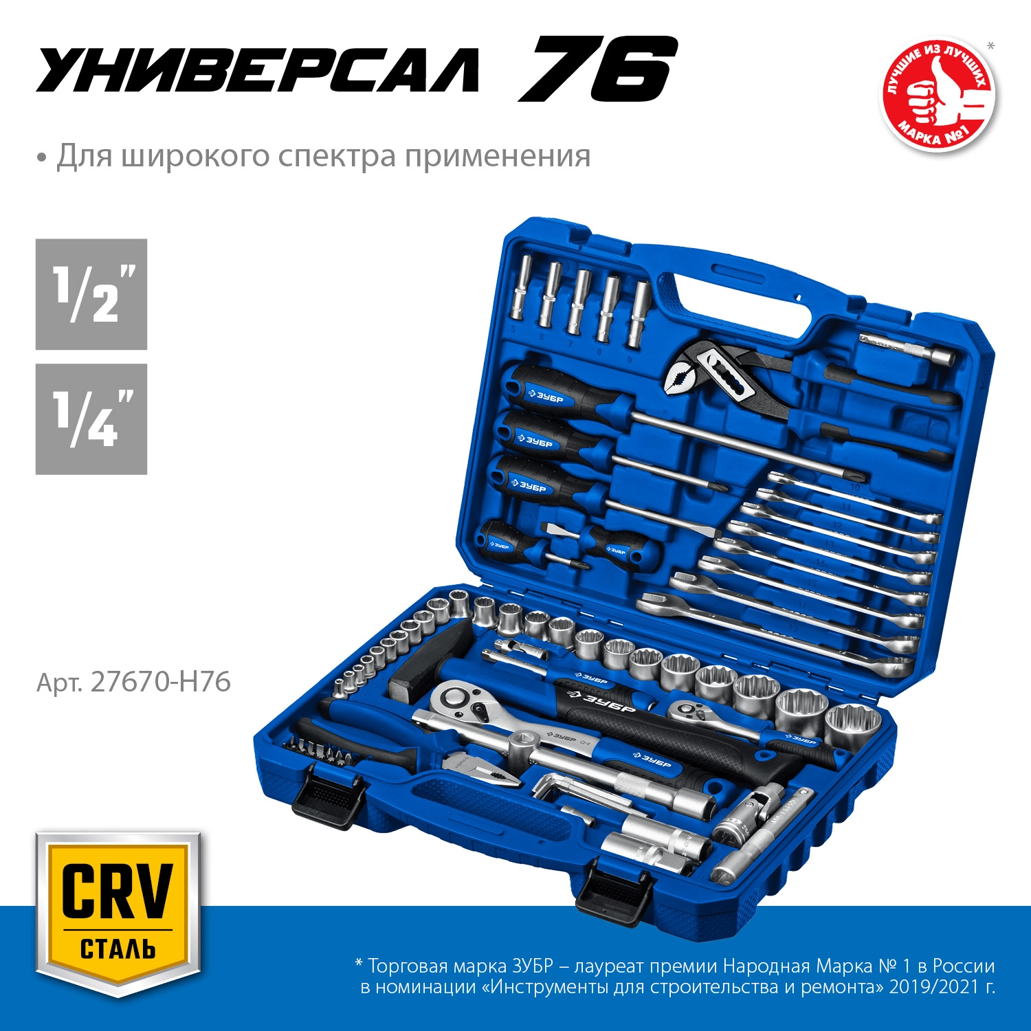 Универсальный набор инструментов ЗУБР 27670-H76, предназначен для выполения слесарных, монтажных и ремонтных работ. Хромированное покрытие для защиты от коррозии. Высококачественная Cr-V сталь. Многоступенчатая закалка для придания баланса прочности и твердости. Профиль FLANK для быстрого и точного захвата крепежа.Производитель: Крафтул И/Е Гмбх, Альтер Поствег Штр., Лоенинген, Германия