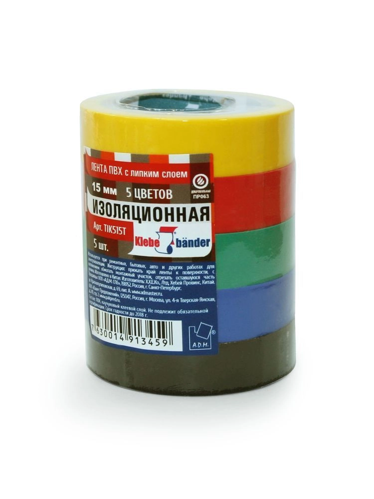 ХарактеристикиАртикул 14237Бренды KlebebanderСтрана производства КитайТип изделия Изолента ПВХШирина, мм 15Длина, м 10Набор изоленты - отличное решение для бытового ремонта и изоляции. Кроме того, разноцветный набор подойдет для творчества и рукоделия. Изолента обладает высокой эластичностью, выдерживает напряжение пробоя до 4Кв, не подлежит горению. Соответствует требованиям ГОСТ 16214-86.Производитель: А.Д.М., РФ, г. Санкт-Петербург