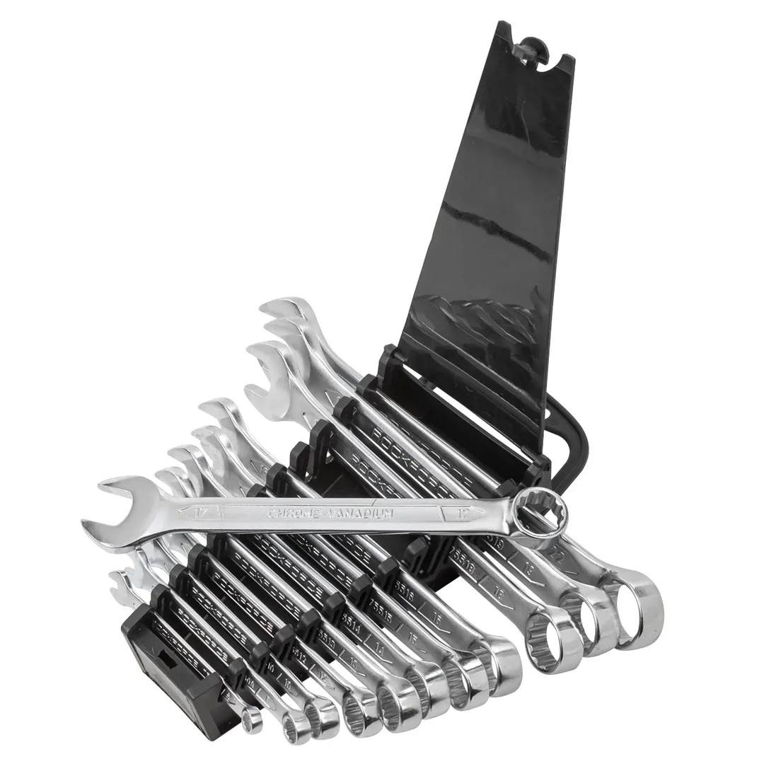 Ключи комбинированные – универсальные гаечные ключи, совмещающие в себе функционал и преимущества рожковых и накидных ключей. Зевы комбинированных ключей имеют одинаковые размеры. Ключи гаечные с открытым и кольцевым зевами предназначены для монтажа либо демонтажа резьбовых соединений. Набор изготовлен из высококачественной стали Cr-V.