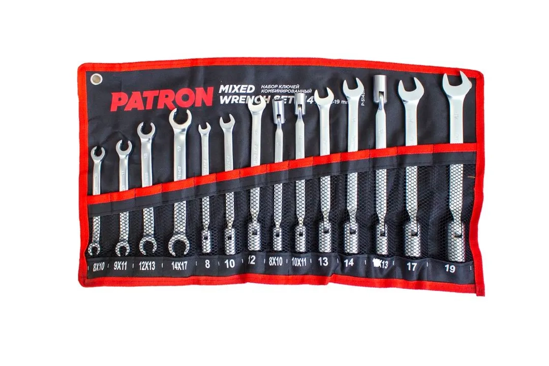 ПроизводителиНабор ключей комбинированных 14 пр.: рожково-торцевые шарнирные 7 пр. 8-19 мм (P-5145R) PATRON
