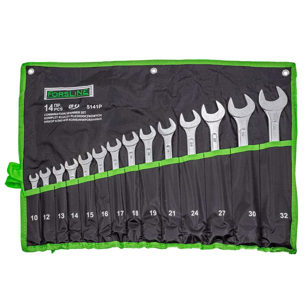 ПроизводителиНабор ключей комбинированных 14пр.(10,12-19,21,24,27,30,32мм),на полотне (FL-5141P) ForsLine