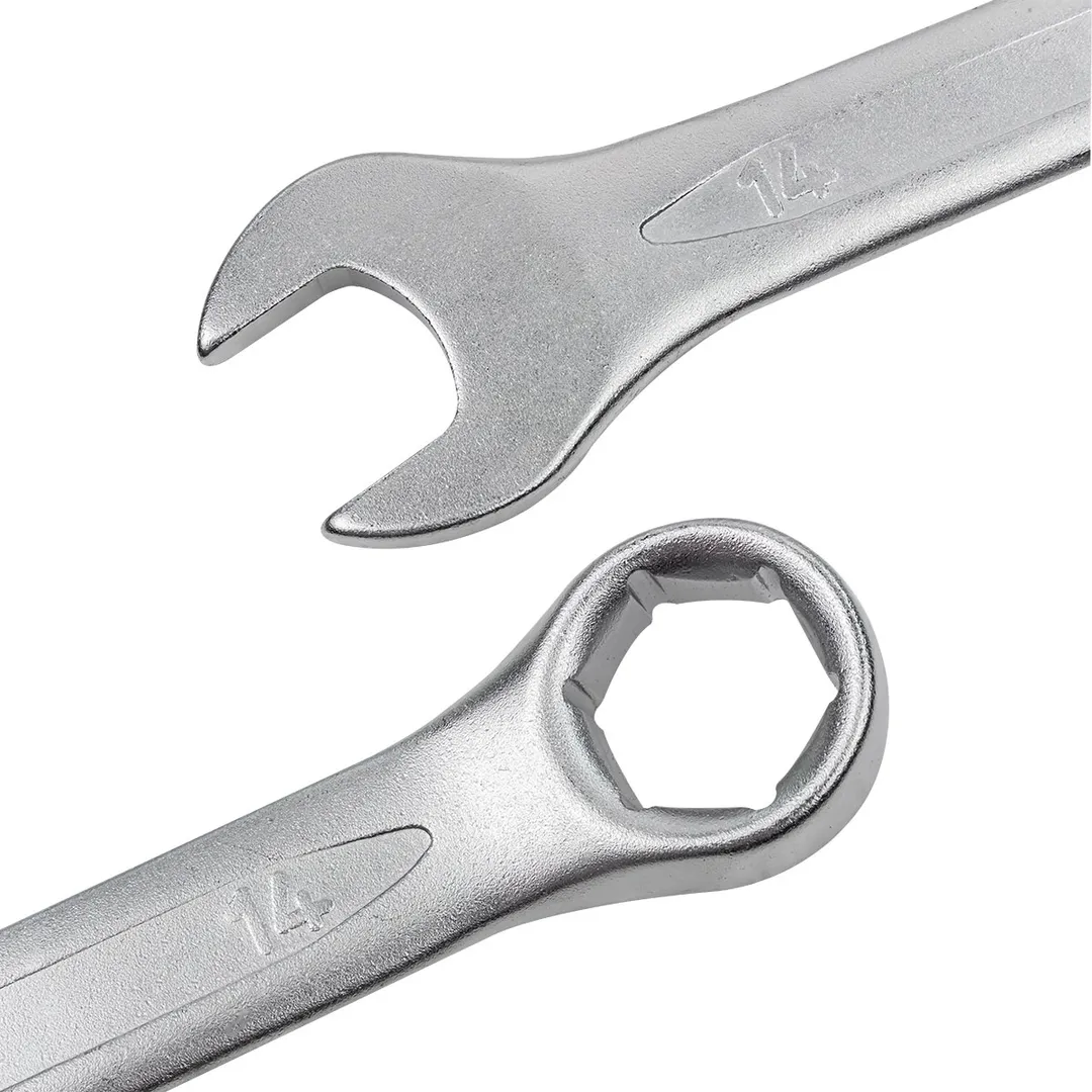 Ключи комбинированные – универсальные гаечные ключи, совмещающие в себе функционал и преимущества рожковых и накидных ключей. Зевы комбинированных ключей имеют одинаковые размеры. Ключи гаечные с открытым и кольцевым зевами предназначены для монтажа либо демонтажа резьбовых соединений. Накидная часть ключа имеет шестигранный профиль, что позволяет приложить болшие усилия на крепеж по сравнению с двенадцитигранным профилем. Набор изготовлен из высококачественной стали Cr-V.