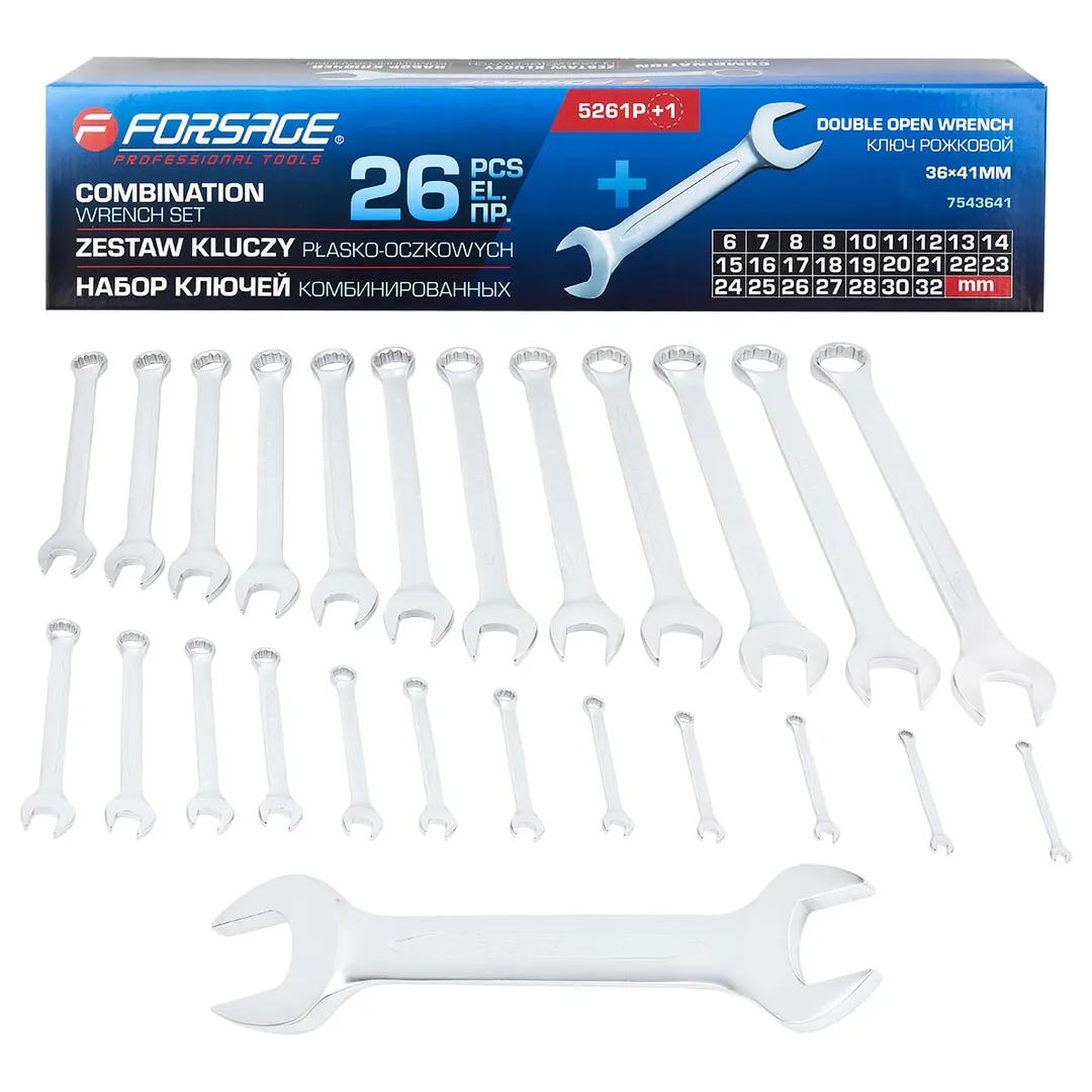 ПроизводителиНабор ключей комбинированных 25+1пр.(6-28, 30, 32мм+ключ рожковый 36х41мм)(F-5261P+1) Forsage