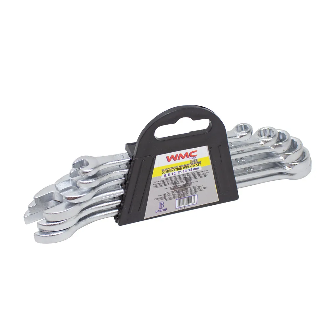 Ключи комбинированные из 6 предметов от бренда WMC Tools - ручной инструмент для работы с различными резьбовыми соединениями. Комбинированные гаечные ключи являются универсальными, так как совмещают в себе рожковый и накидной ключ одного размера. Накидная часть применяется для работы с тугими крепежными соединениями, а рожковая применятся, если нет возможности накинуть ключ на соединение сверху - в таком случае можно работать с какой-то из сторон рожковым гаечным ключом.