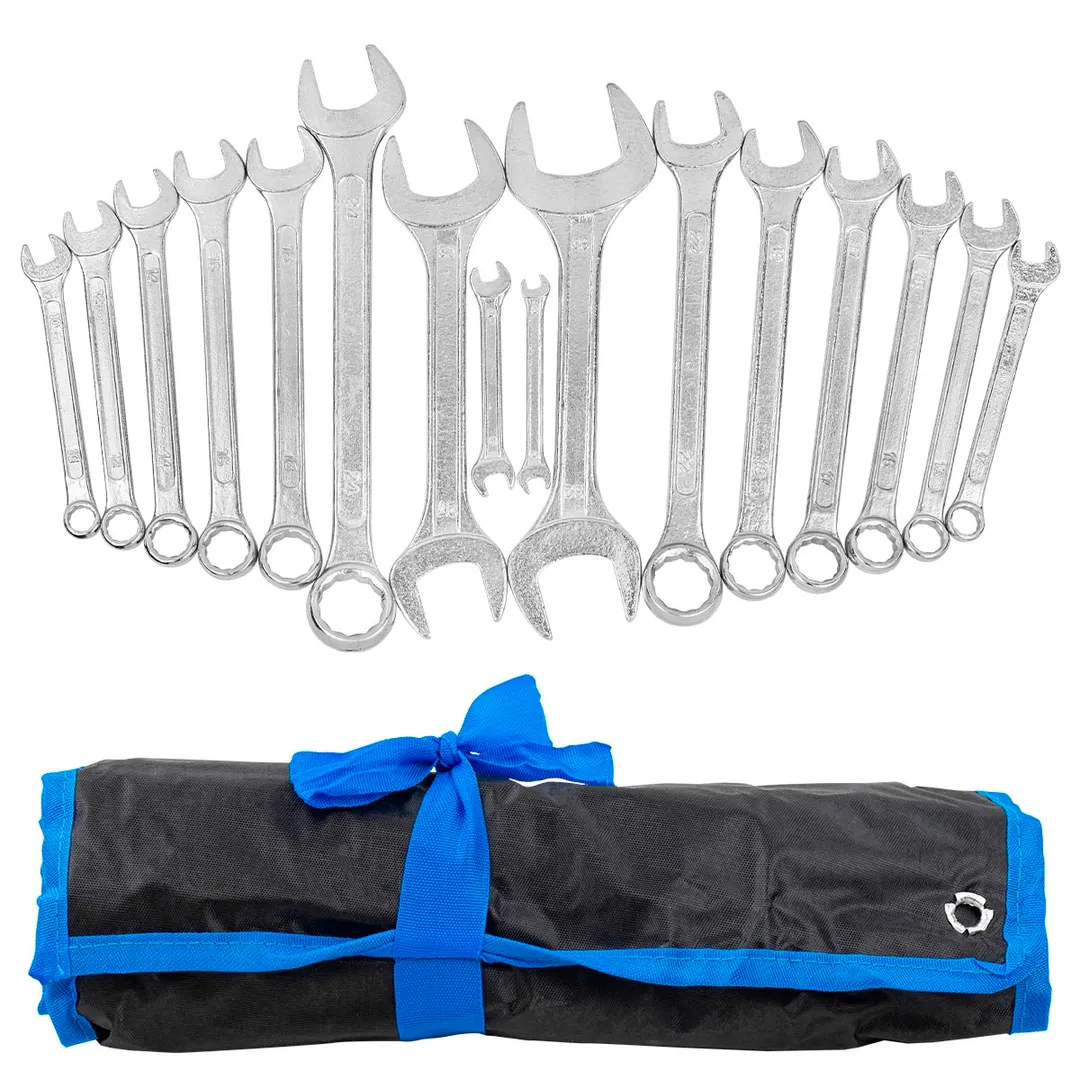 Набор ключей рожковых и комбинированных включает 16 предметов. Гаечные ключи с открытым зевом обладают двумя рабочими головками с открытым зевом. Такой ключ позволяет работать, когда над гайкой мало места, а вокруг гайки свободно. Он незаменим, когда торец гайки или болта недоступен и к граням можно подобраться только с боку, надвигая ключ. Захват осуществляется рожками - отсюда и название "рожковый ключ". Ключи комбинированные – универсальные гаечные ключи, совмещающие в себе функционал и преимущества рожковых и накидных ключей. Зевы комбинированных ключей имеют одинаковые размеры. Набор изготовлен из высококачественной стали Cr-V. Несмотря на простоту конструкции, гаечный ключ применяется практически во всех областях техники для сборки механизмов различных уровней сложности. Этот инструмент традиционно широко представлен на рынке, востребован потребителями и присутствует в арсенале промышленных предприятий, организаций ЖКХ, в автосервисе, на СТО.