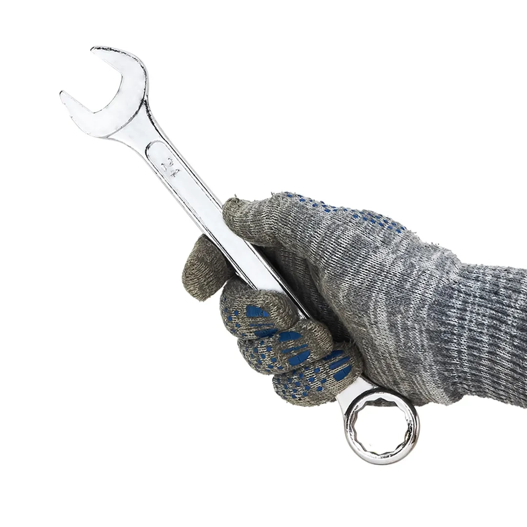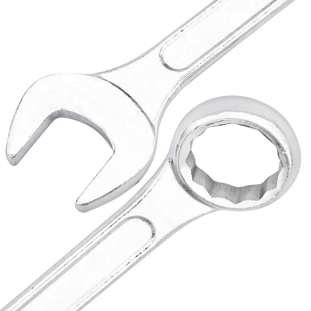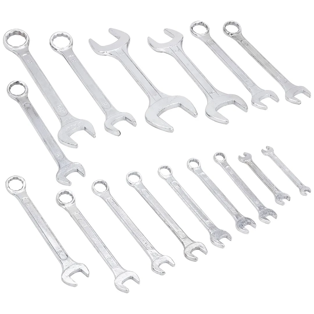 Набор ключей рожковых и комбинированных включает 16 предметов. Гаечные ключи с открытым зевом обладают двумя рабочими головками с открытым зевом. Такой ключ позволяет работать, когда над гайкой мало места, а вокруг гайки свободно. Он незаменим, когда торец гайки или болта недоступен и к граням можно подобраться только с боку, надвигая ключ. Захват осуществляется рожками - отсюда и название "рожковый ключ". Ключи комбинированные – универсальные гаечные ключи, совмещающие в себе функционал и преимущества рожковых и накидных ключей. Зевы комбинированных ключей имеют одинаковые размеры. Набор изготовлен из высококачественной стали Cr-V. Несмотря на простоту конструкции, гаечный ключ применяется практически во всех областях техники для сборки механизмов различных уровней сложности. Этот инструмент традиционно широко представлен на рынке, востребован потребителями и присутствует в арсенале промышленных предприятий, организаций ЖКХ, в автосервисе, на СТО.