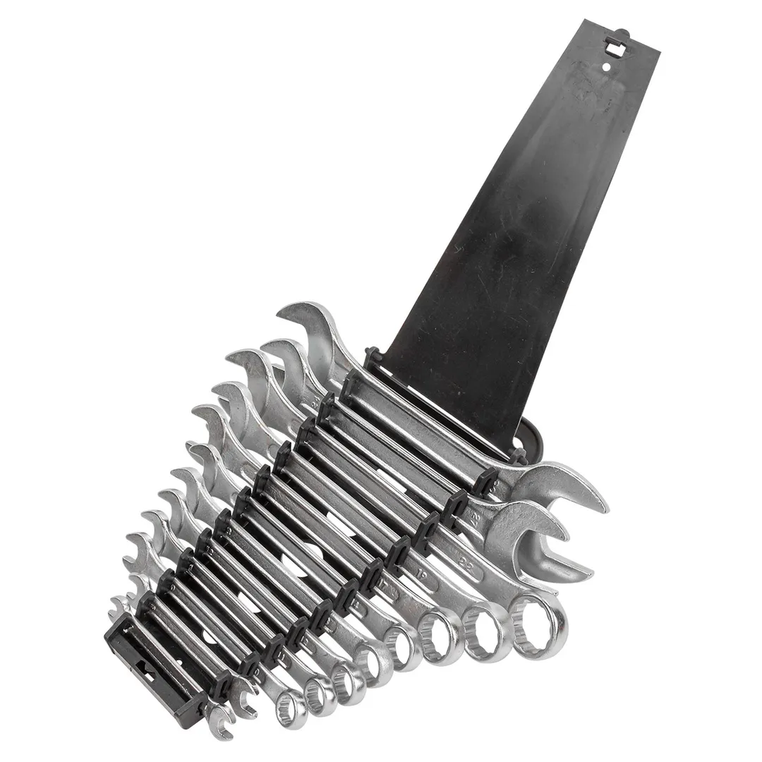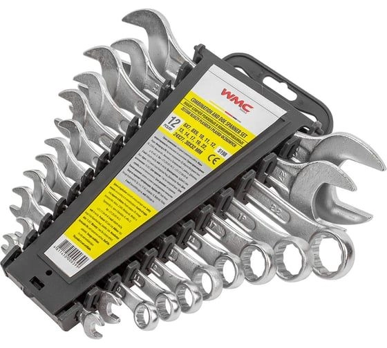 Набор ключей рожковых и комбинированных 12 предметов на пластиковом держателе от бренда WMC TOOLS это самый распространённый и популярный тип гаечного ключа, сочетающий в конструкции рожковый и накидной профили.
