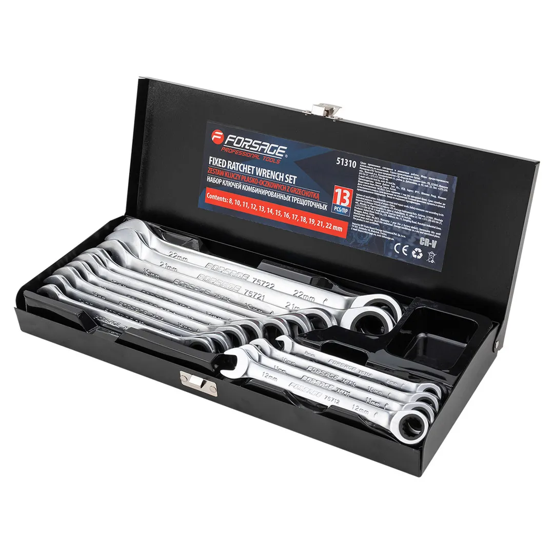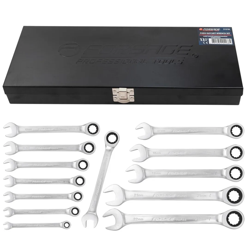 ПроизводителиНабор ключей комбинированных трещоточных, 13пр. (8,10-19,21,22мм) в мет. кейсе (F-51310) Forsage