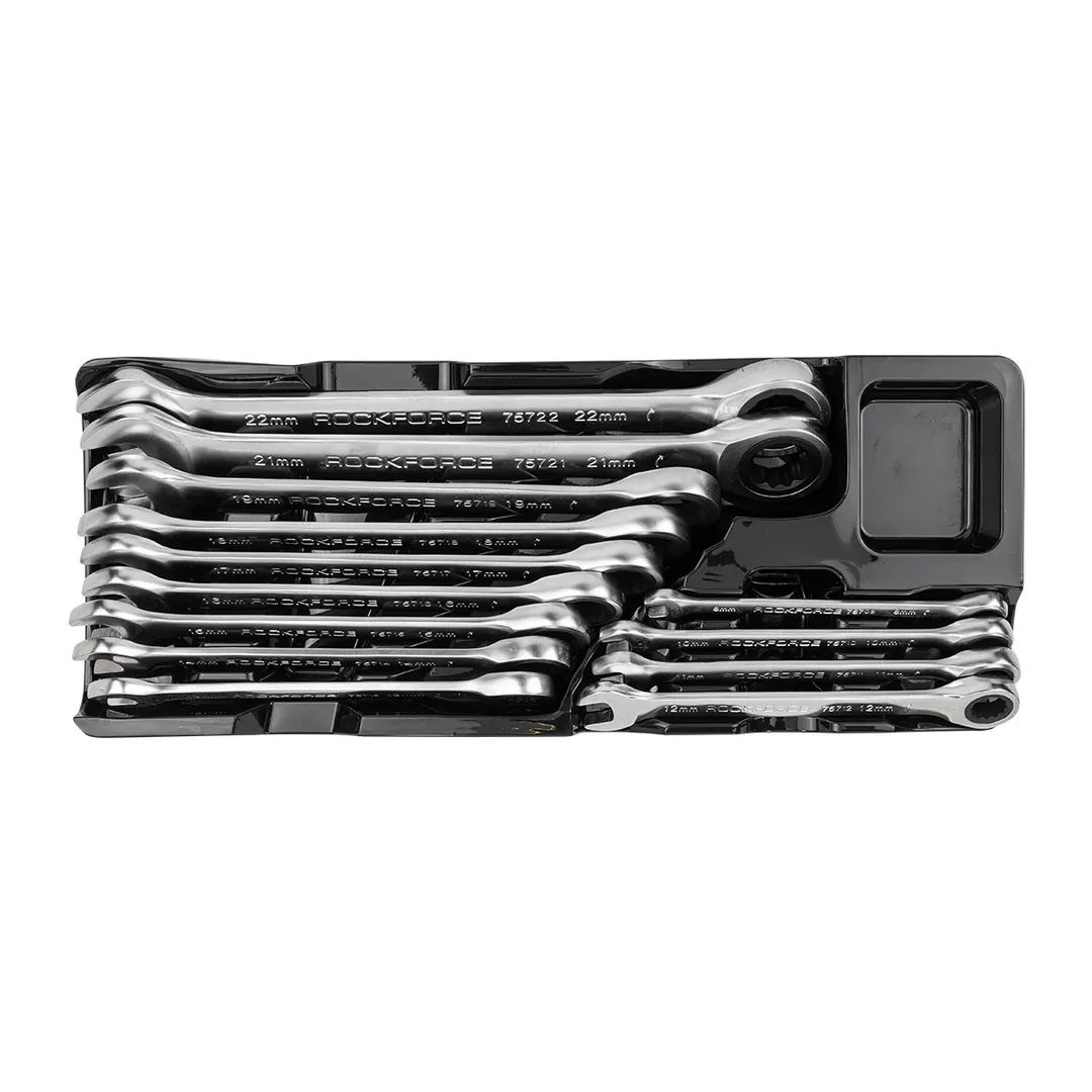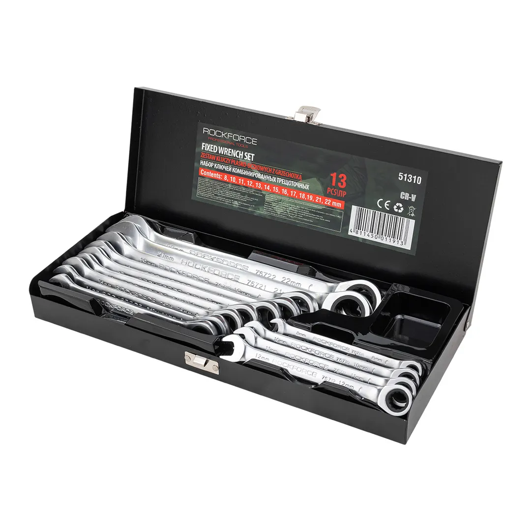 ПроизводителиНабор ключей комбинированных трещоточных, 13пр. (8-22мм) в мет. кейсе (RF-51310) RockFORCE