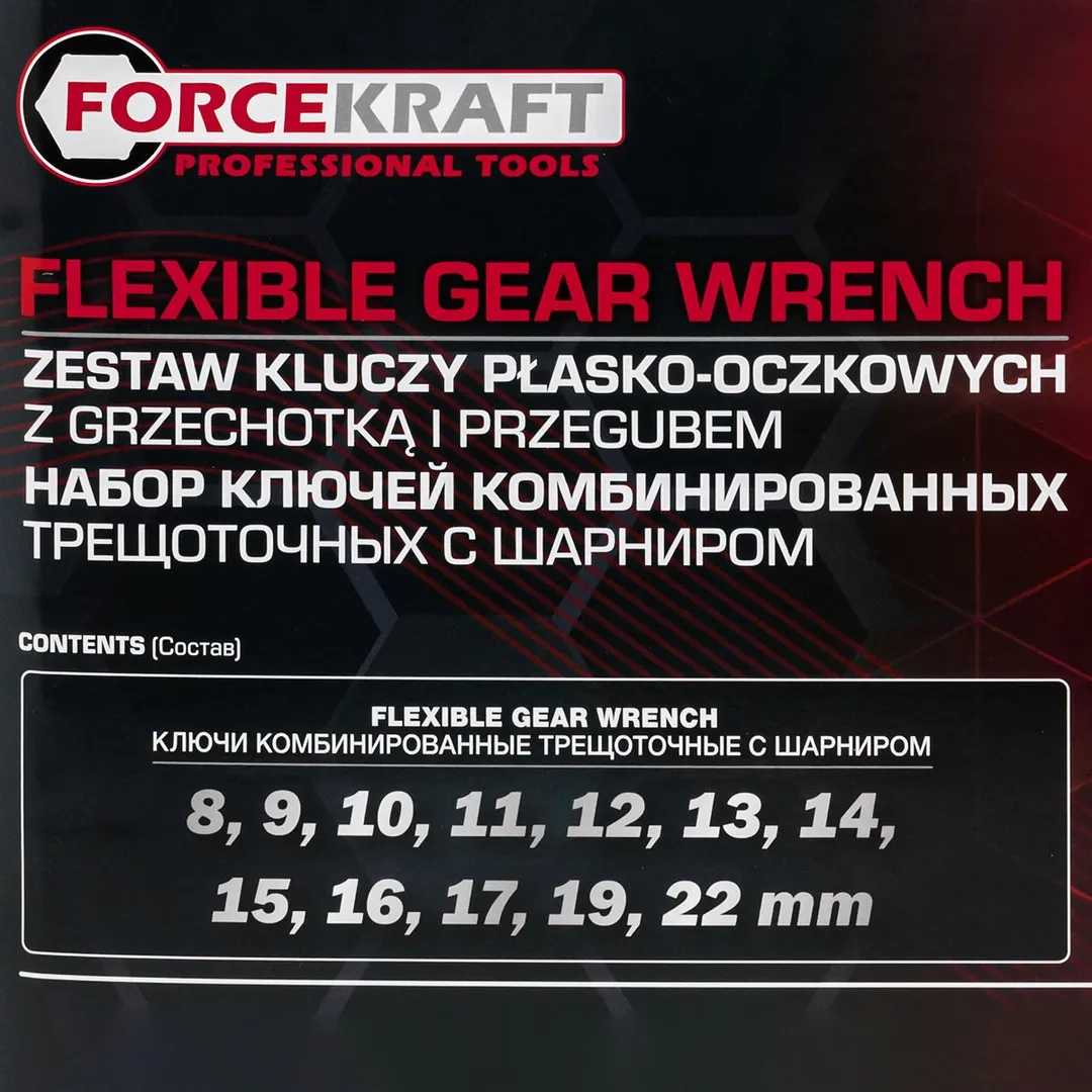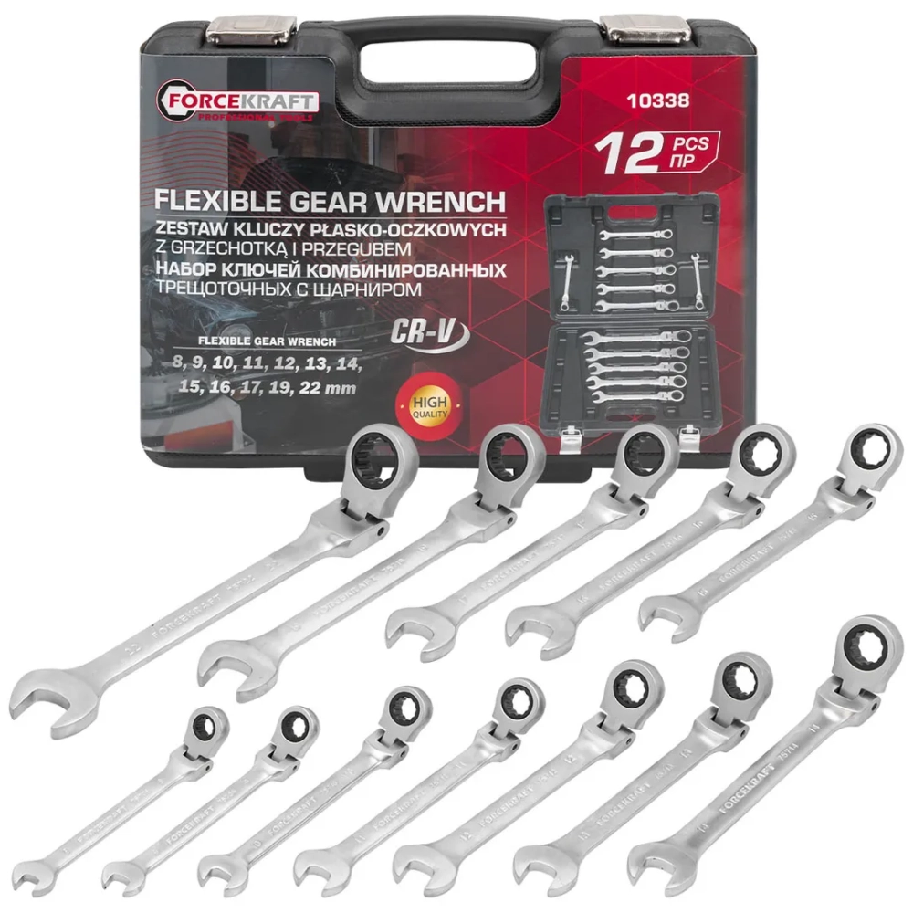 ПроизводителиНабор ключей комбинированных трещоточных с шарниром 12пр. (FK-10338) FORCEKRAFT