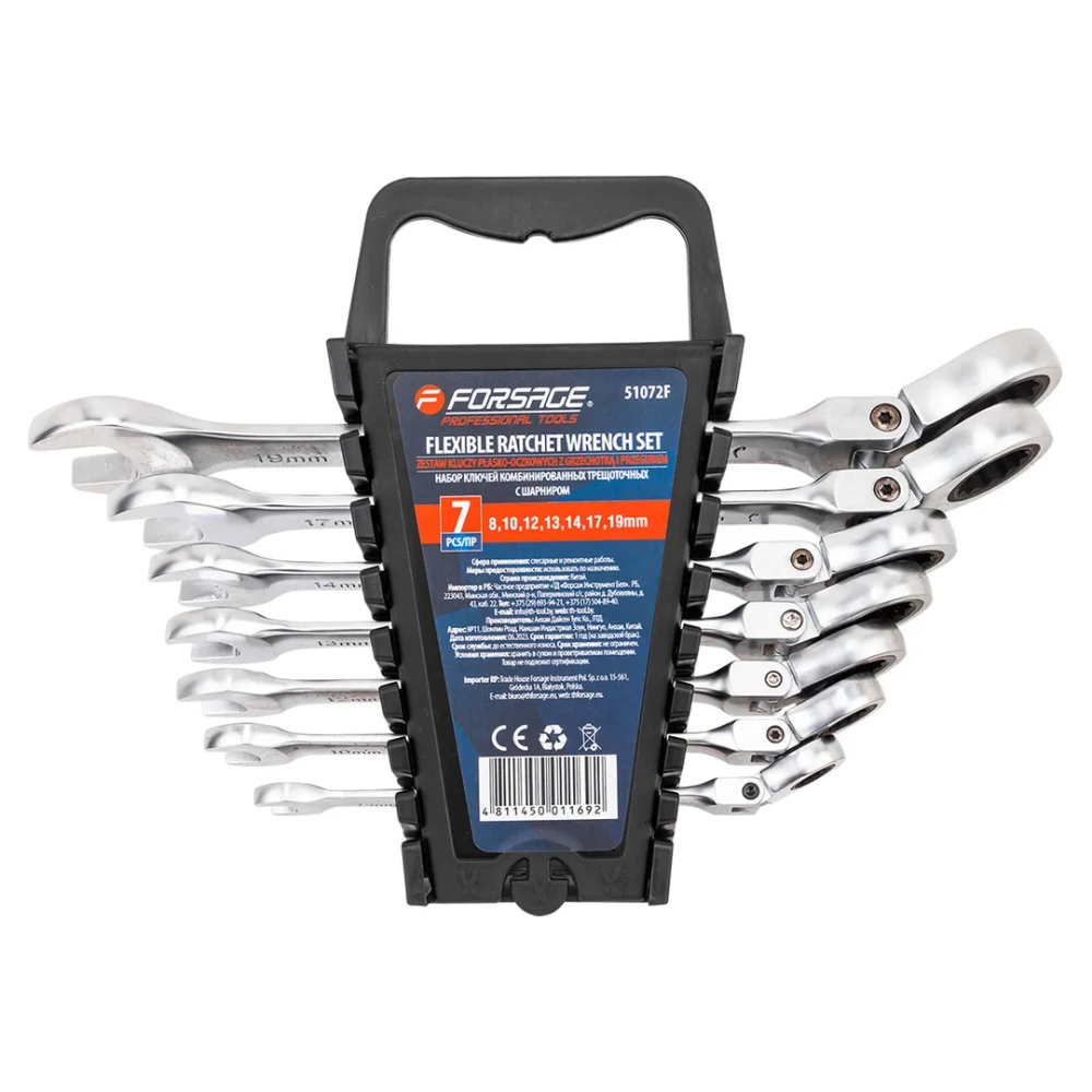 ПроизводителиНабор ключей комбинированных трещоточных с шарниром 7пр. 8-19мм (F-51072F) Forsage