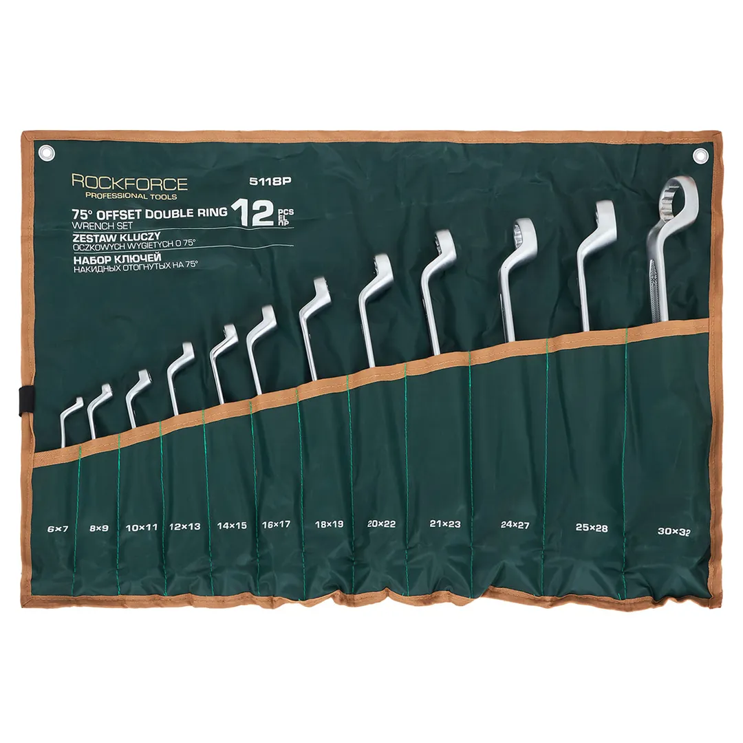 Набор накидных ключей отогнутых на 75грд.12-гранных на полотне представляет собой комплект инструмента высокой прочности. Для работы с крепежом можно прикладывать значительные усилия. Ключи имеют отогнутую часть, которая позволяет добраться до гайки или болта, которые расположены под углом или в труднодоступных местах. Размеры ключей: 6x7,8x10,10x11,12x13,14x15,16x17,18x19,21x23,22x24,27x30, 32x36мм.Производитель: Рок Форс, Лтд.