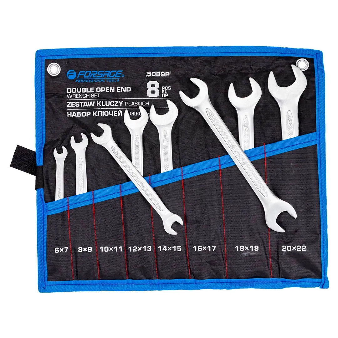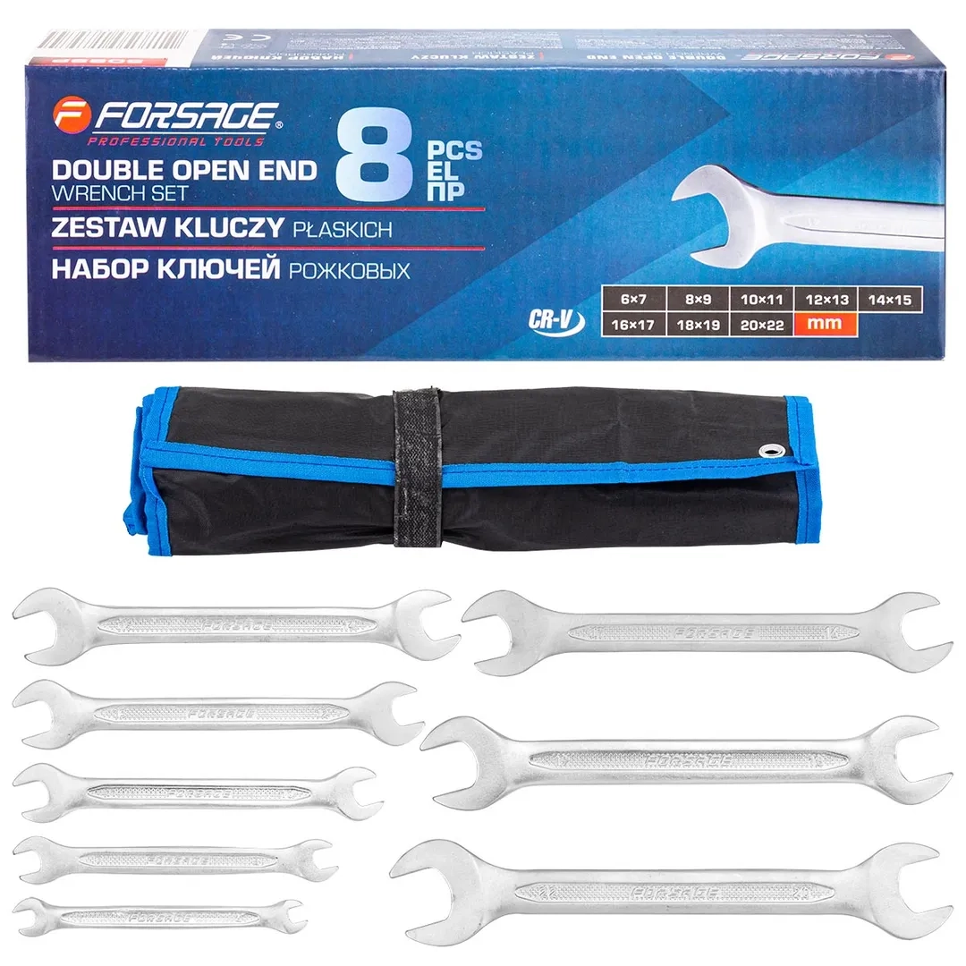 ПроизводителиНабор ключей рожковых, 8пр. (6х7, 8х9, 10х11, 12х13, 14х15, 16х17, 18х19, 20х22мм) (F-5089P) Forsage