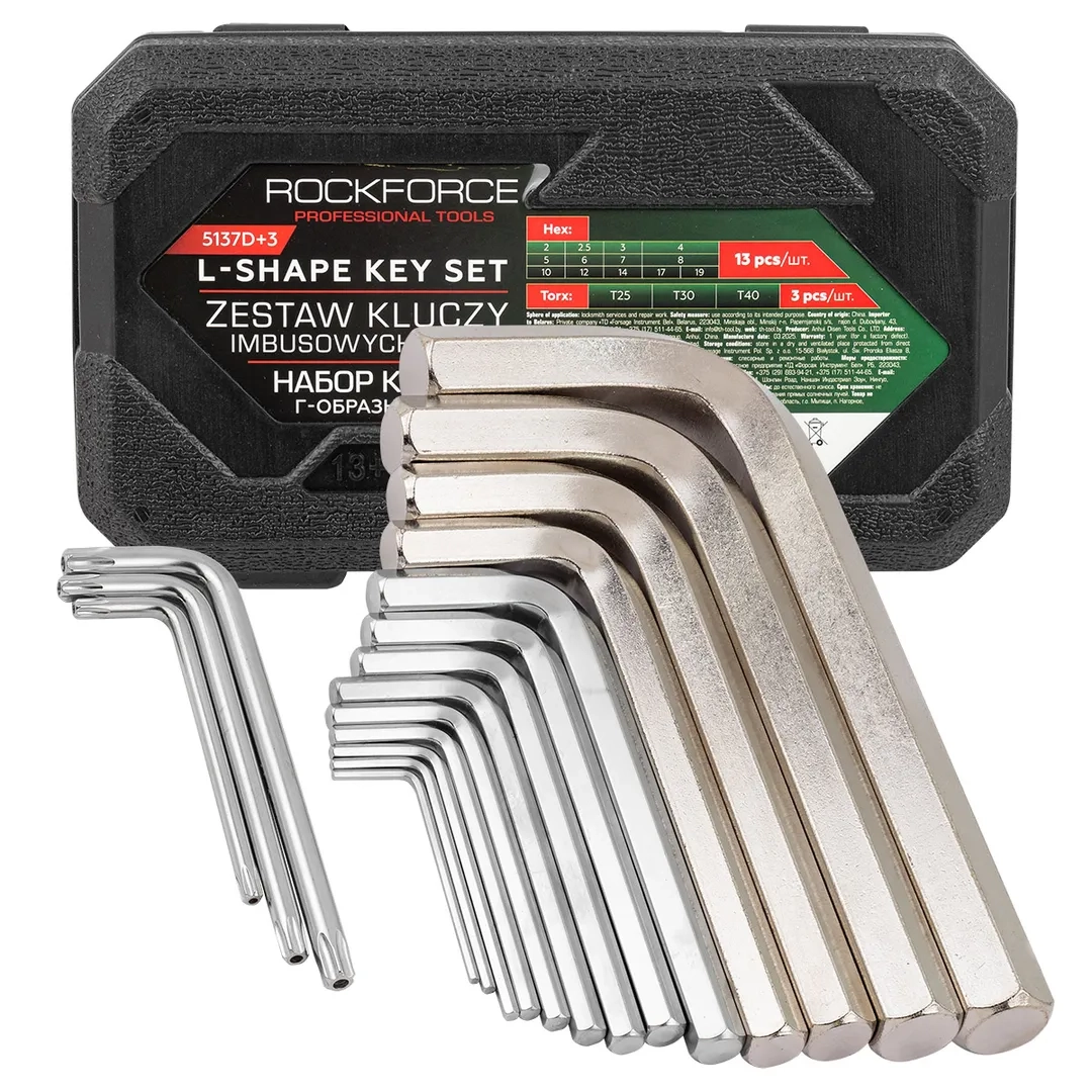 ПроизводителиНабор ключей шестигранных, 13+3пр. (2-19мм + T25, T30, T40) (RF-5137D+3) RockFORCE
