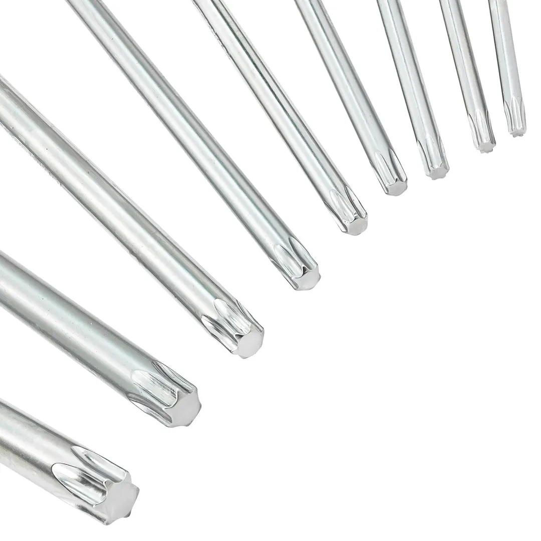 Набор ключей Г-образных Torx экстрадлинных - это профессиональный инструмент для закручивания и откручивания деталей с соответствующими отверстиями. Набор Г-образных ключей - это универсальный набор инструментов для слесарно-монтажных работ, содержащий 9 ключей разных размеров. Ключи изготовлены из хромованадиевой стали, отличаются высокой прочностью и устойчивостью к износу. Каждый ключ имеет свой размер и форму, которые позволяют обеспечить надежное крепление и фиксацию крепежа с шестигранным профилем. Набор упакован в пластиковый держатель, который обеспечивает удобство хранения и транспортировки инструментов.