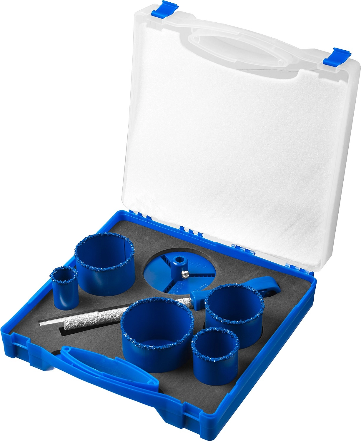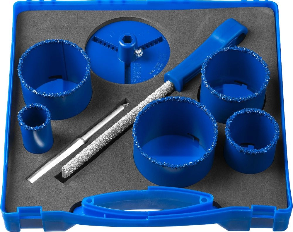 -Комплектация: 8 пр.: коронки 33 - 53 - 67 - 73 - 83 мм, универсальное основание, центрирующее сверло, напильник с карбид вольфрамовым напылением