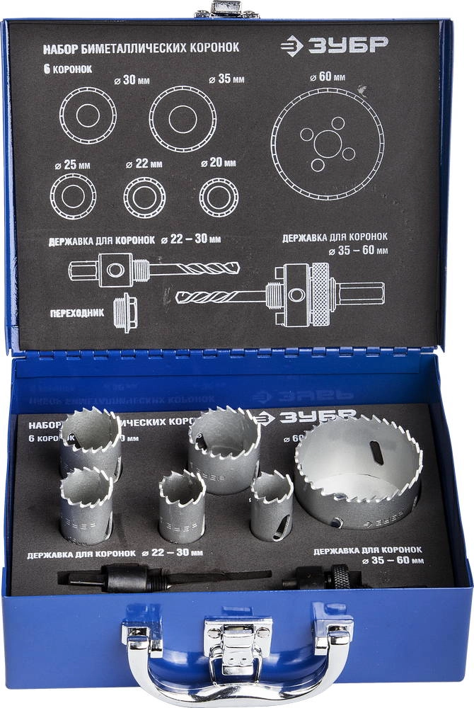 ПроизводителиНабор: Коронки биметаллические, глубина сверления до 38мм, d 20,22,25,30,35,60мм, (29531-H6-1) ЗУБР