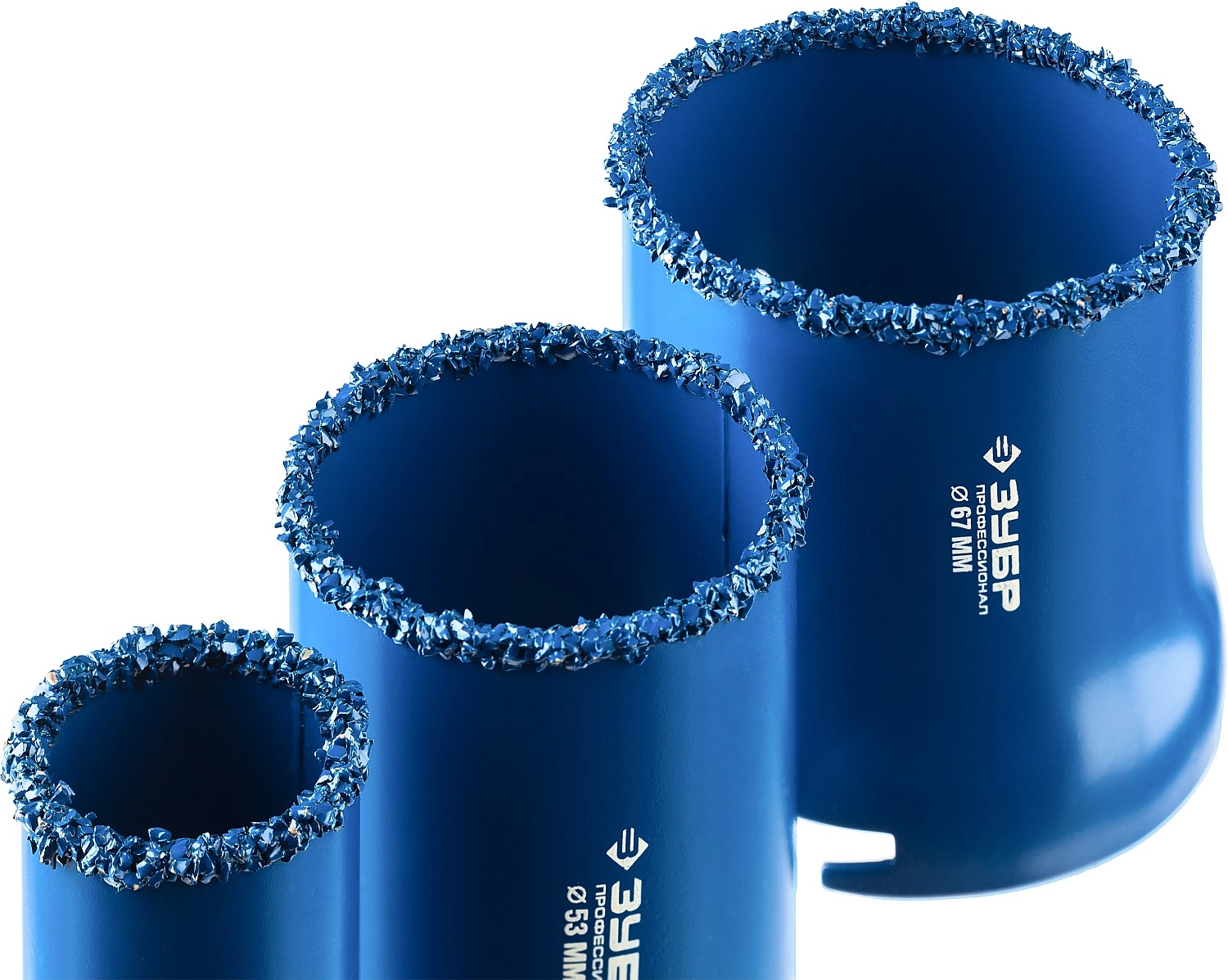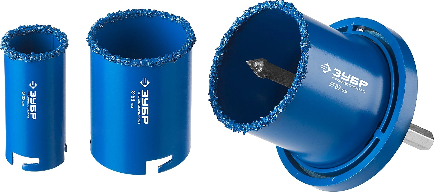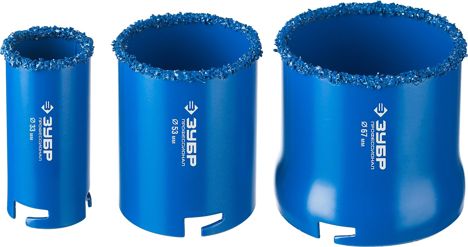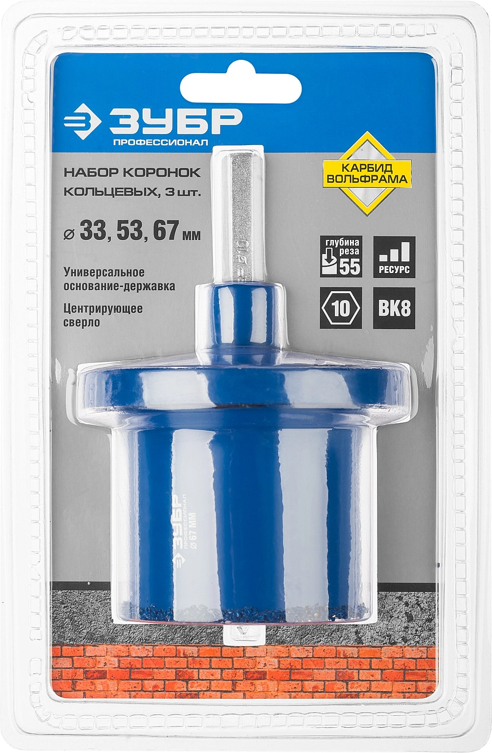ПроизводителиНабор коронок карбид-вольфрамовых 33-53-67мм, с основанием и сверлом, 5пр. (33350-H5) ЗУБР