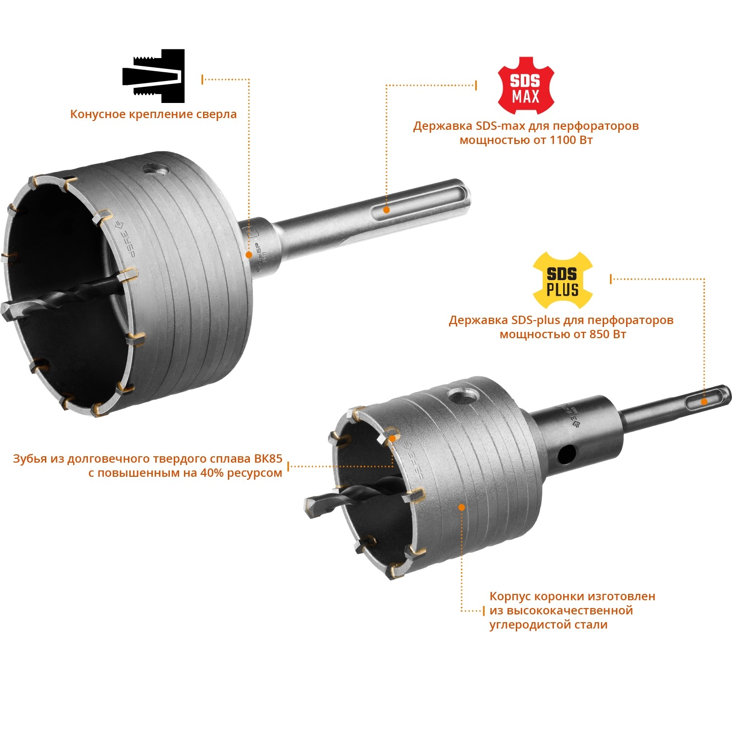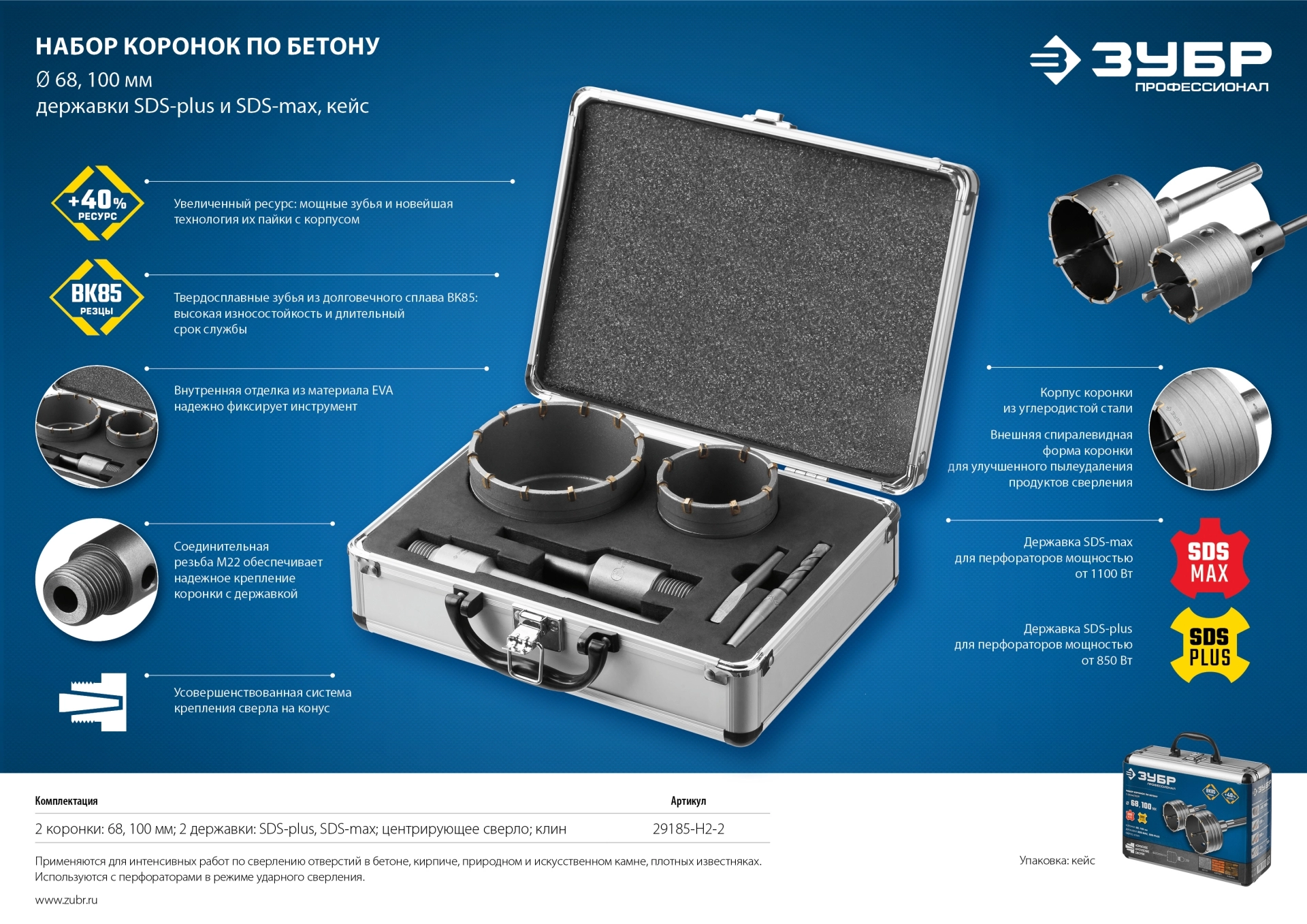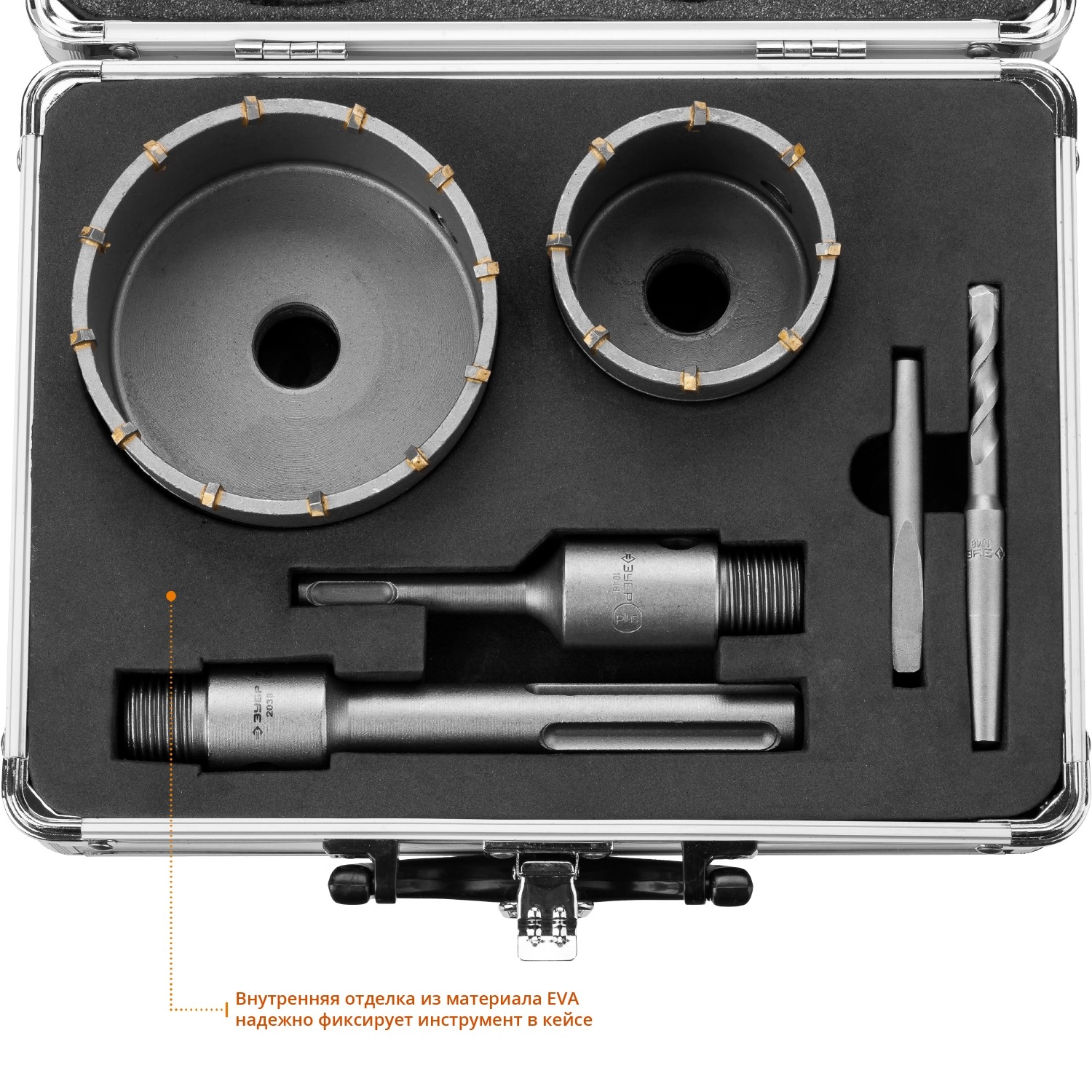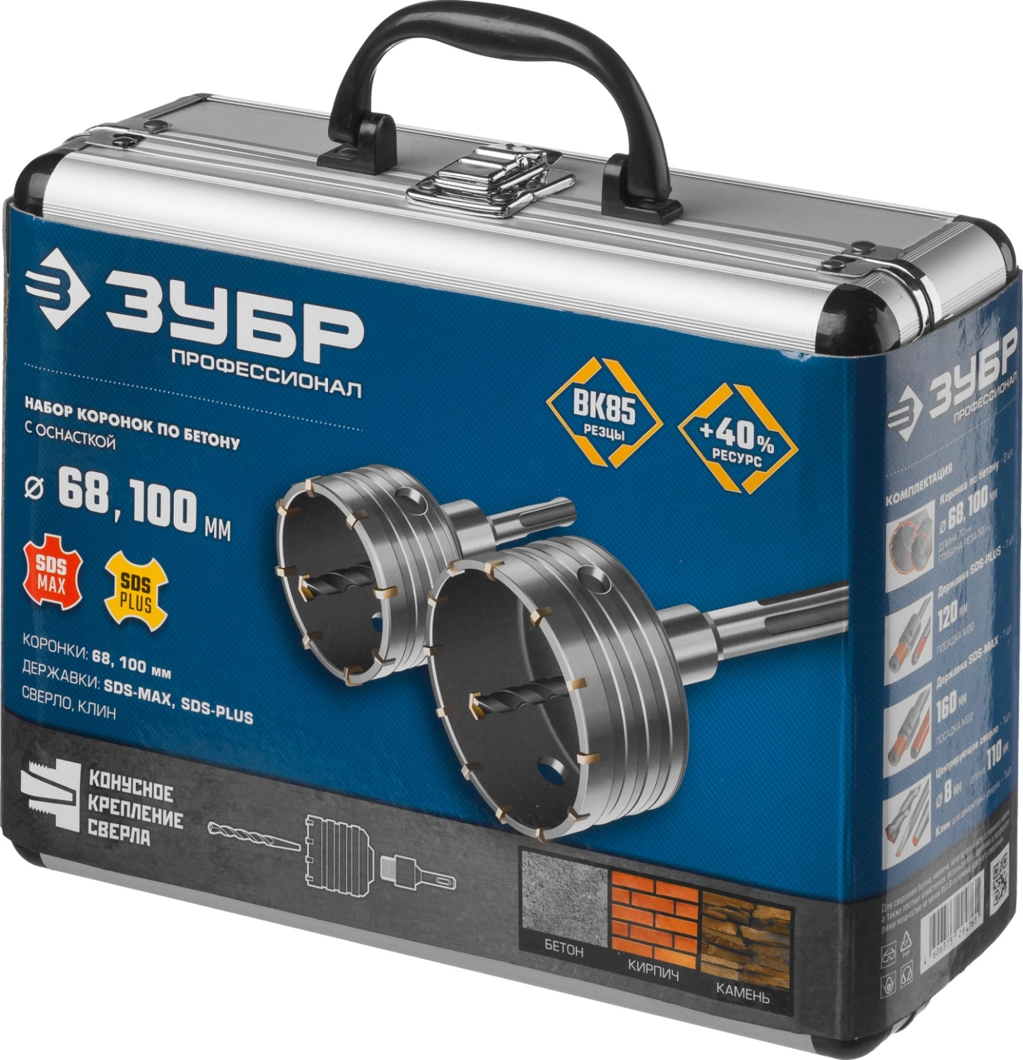ПроизводителиНабор коронок по бетону с оснасткой, d = 68, 100 мм, кейс (29185-H2-2) ЗУБР