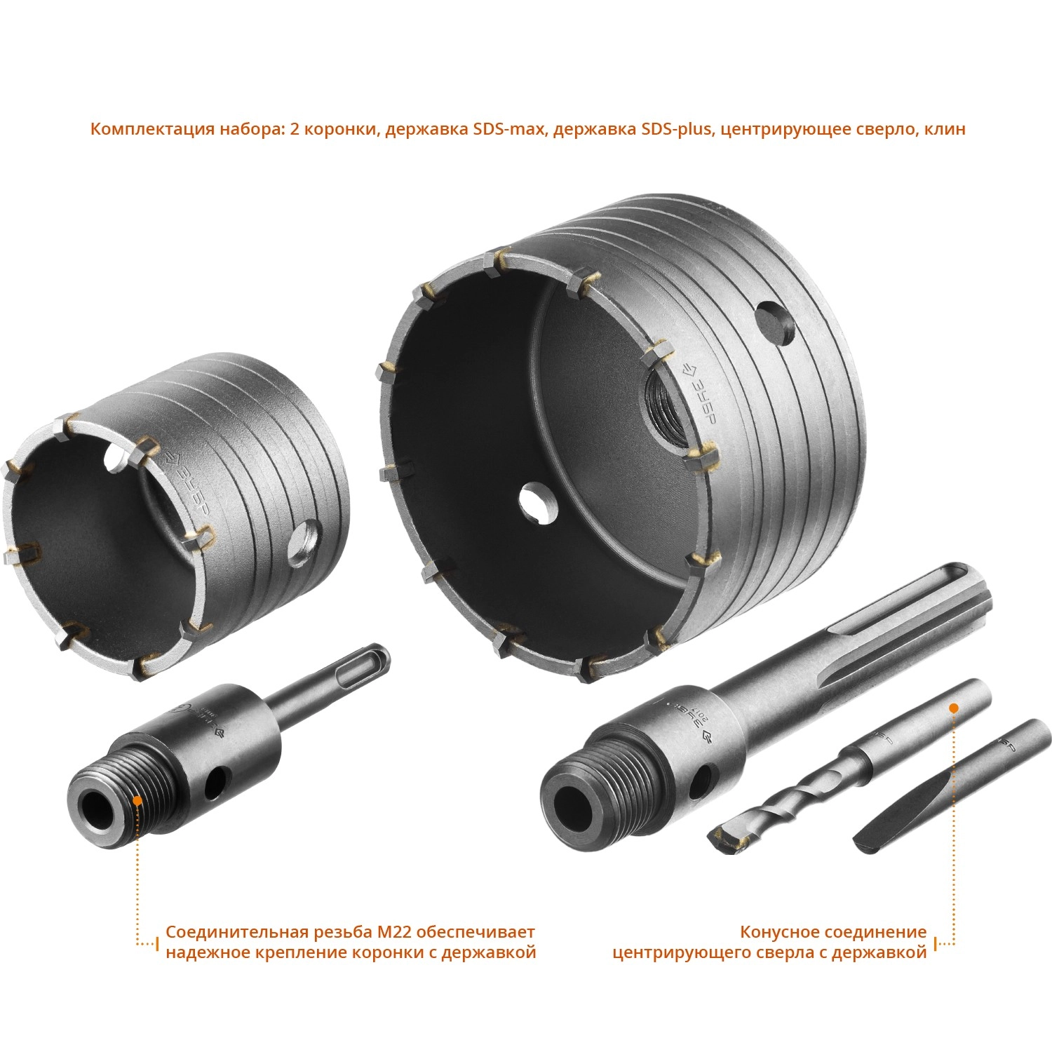 ХарактеристикиАртикул 29185-H2-2Бренды ЗубрСтрана производства КитайТип изделия НаборДиаметр, мм 68-100Хвостовик цилиндрическийВес 2.736При прокладке коммуникаций в строящемся здании не обойтись без коронок по бетону. Они позволяют без труда получать отверстия среднего или большого диаметра в самых прочных материалах. Коронки имеют твердосплавные зубья из сплава ВК85, усовершенствованную систему крепления сверла на конус и резьбовое соединение с державкой М22.