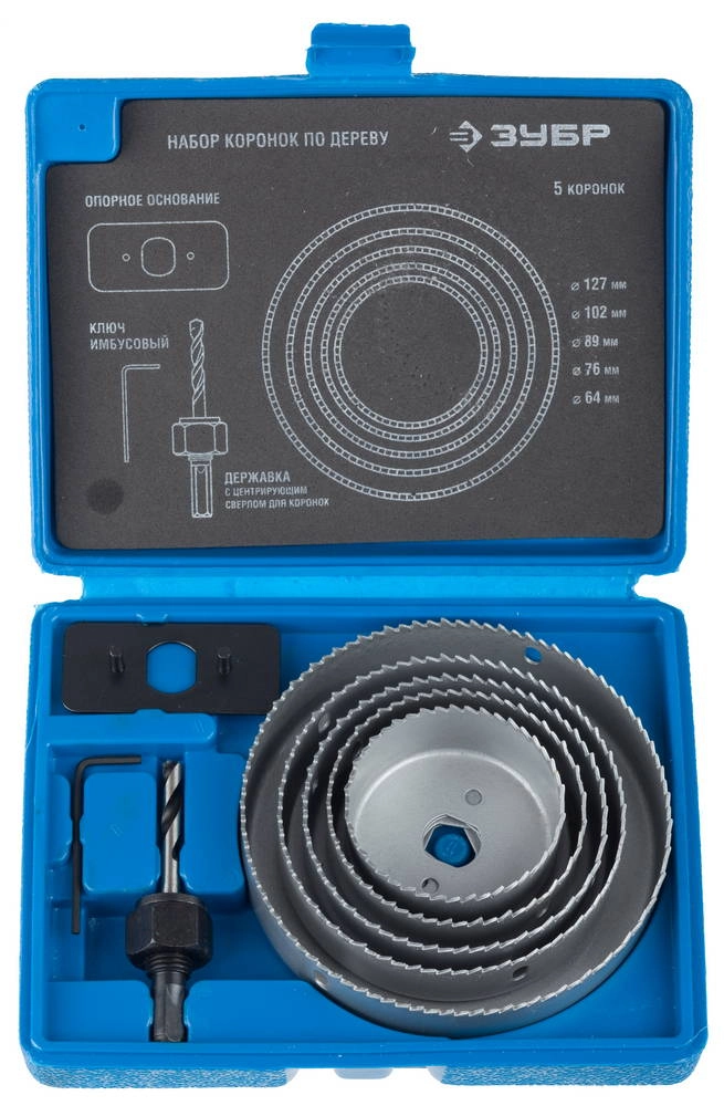 ПроизводителиНабор: Коронки по дереву 64-127мм, державка с опорным основанием, ключ имбусовый 2,5мм, 7 предметов,