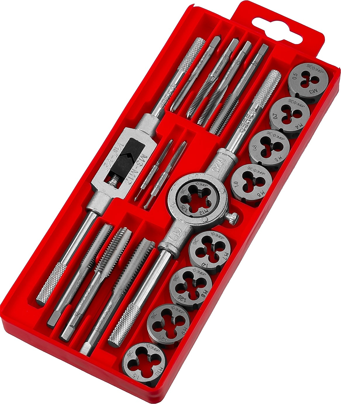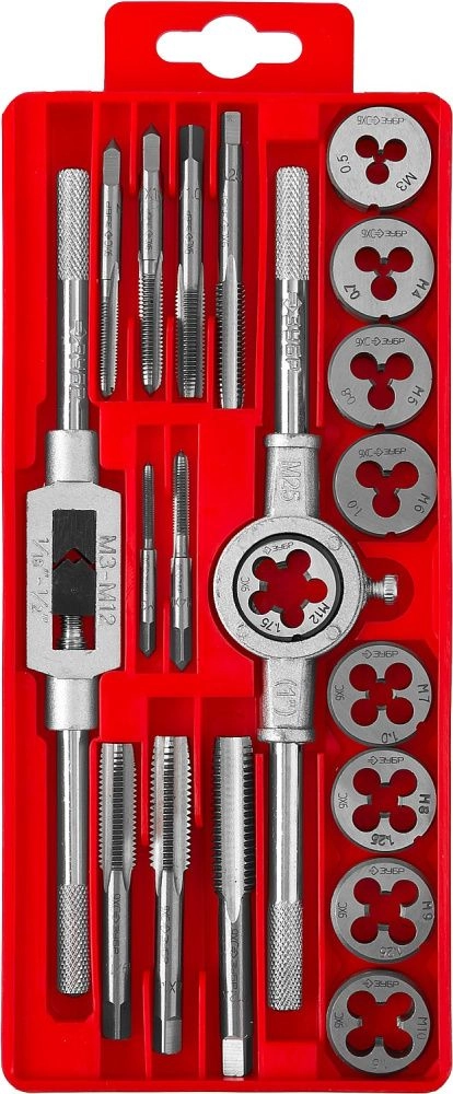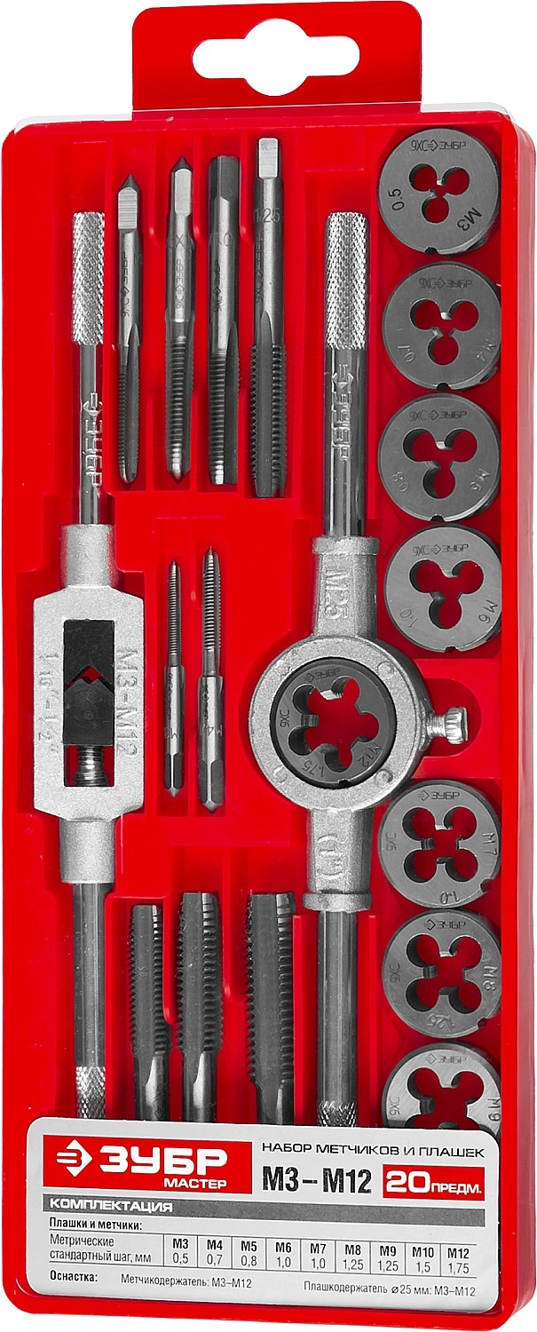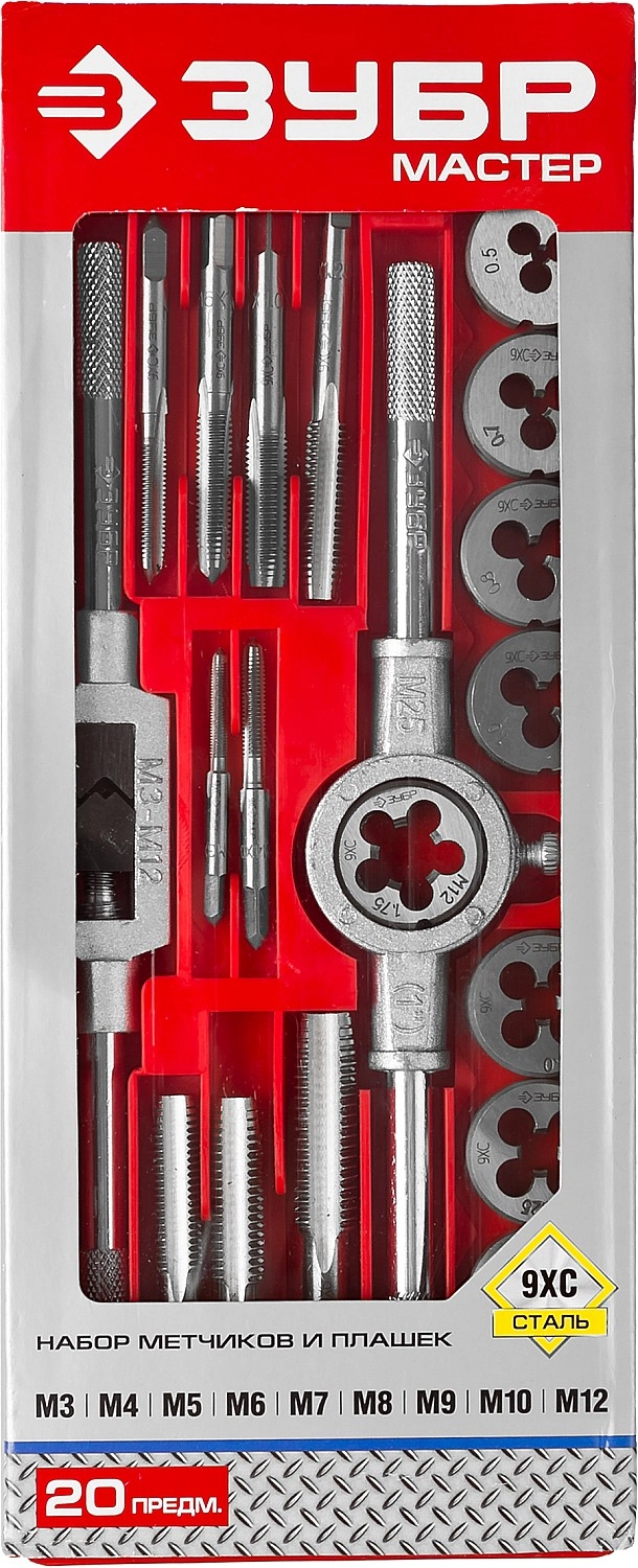 ПроизводителиНабор метчиков и плашек M3-M12, 20пр., 9ХС (2810-H20_z01) ЗУБР