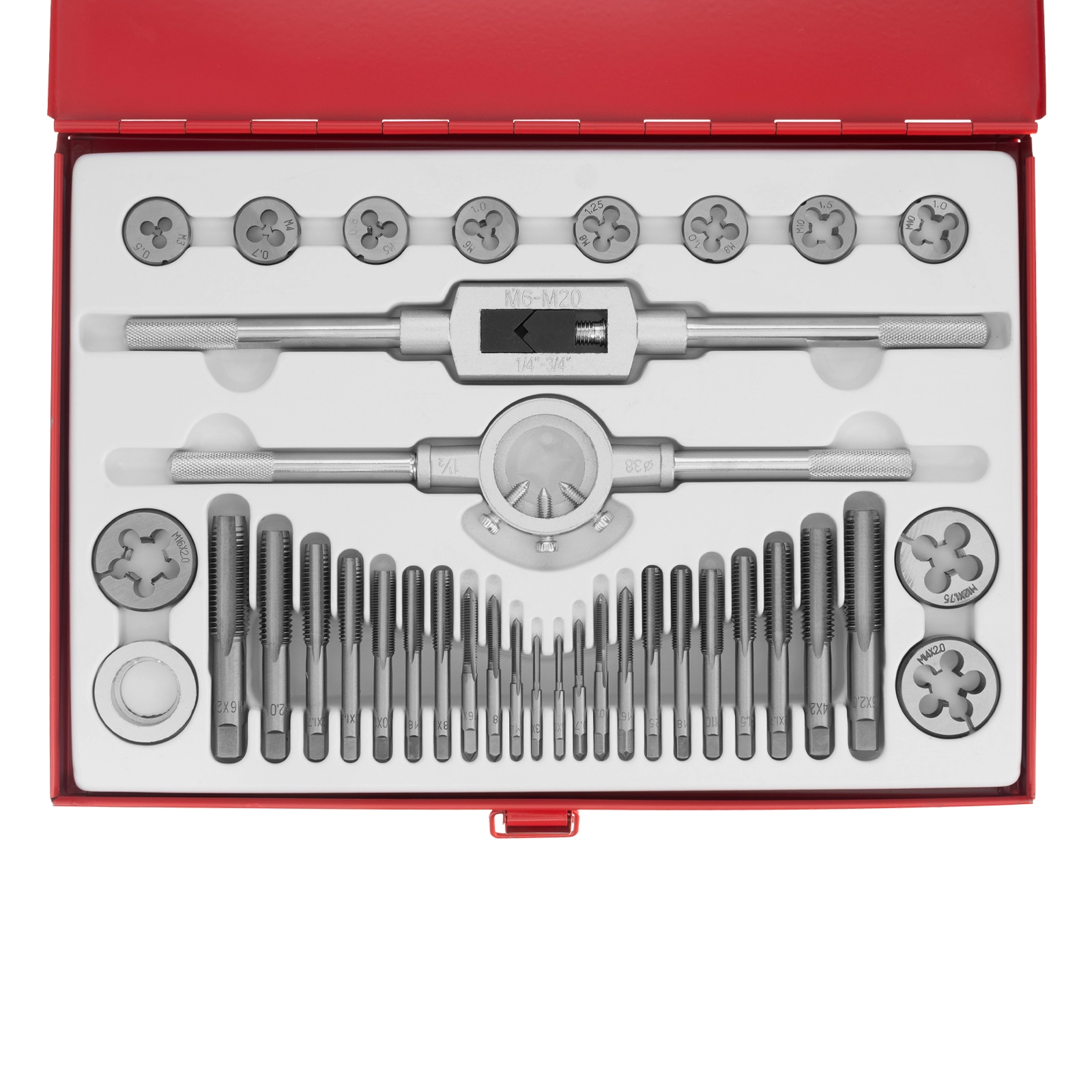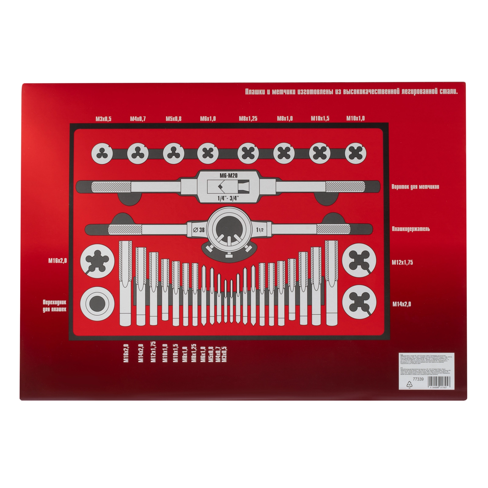 Набор метчиков и плашек М3-М16 Matrix 77339 состоит из 36 предметов — резьбонарезных инструментов, воротка и плашкодержателя с переходником. Используется для создания наружной и внутренней резьбы в сквозных и глухих отверстиях металлических деталей. С его помощью можно восстанавливать поврежденные резьбовые участки. Набор поставляется в металлическом кейсе, поэтому не потеряется при хранении или транспортировке. Будет полезен в слесарной мастерской, а также пригодится для бытового ремонта.Производитель: ООО "Мир инструмента", Россия