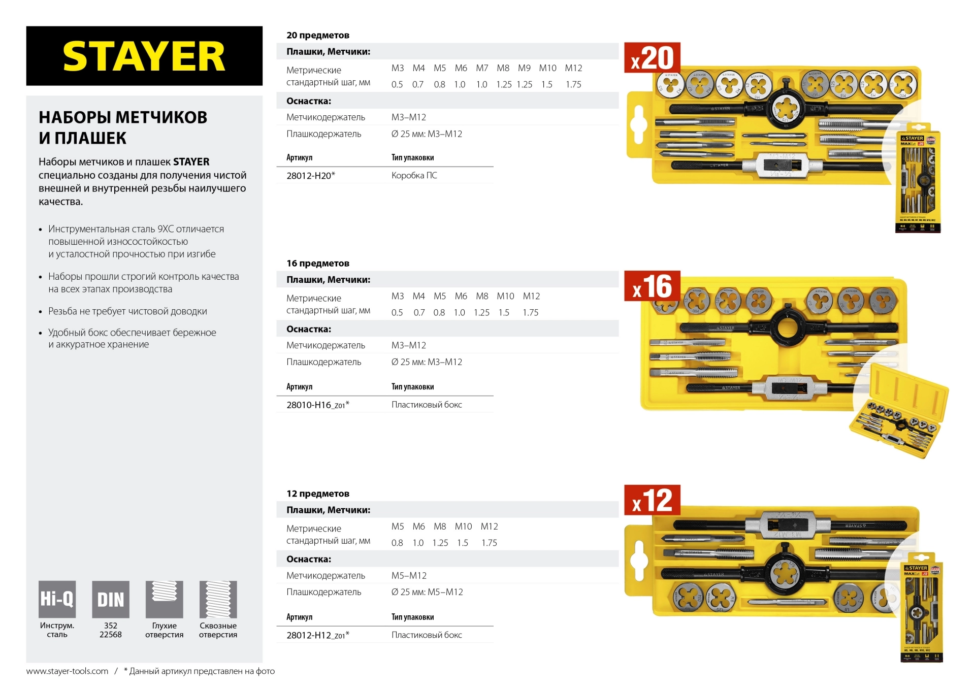 СТАНДАРТУровень качества. При классификации продуктов, имеющих схожее наименование, но обладающие различными потребительскими свойствами мы приняли следующий Вес факторов: 80% - подтвержденный ресурс, 15% - заявленная производительность/скорость, 5% - субъективные ощущения потребителя. ПодробнееКод товара: 0020514(0)Набор метчиков и плашек STAYER отлично подходит для получения качественной и чистой внешней и внутренней резьбы85.30 руб. Скидка только для физ. лиц 7% 78.97 руб. за шт