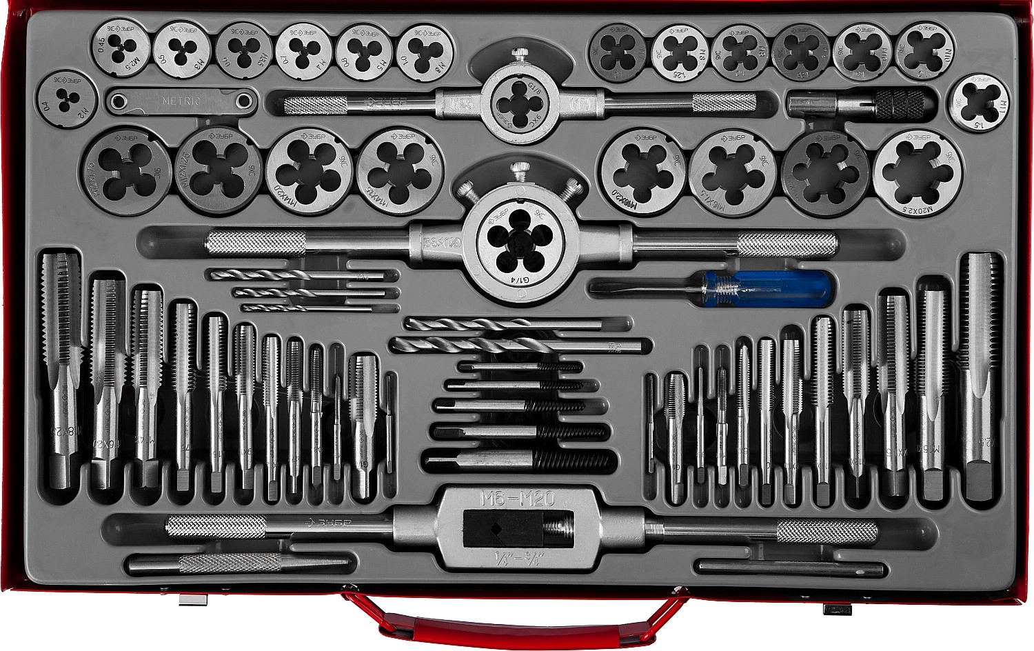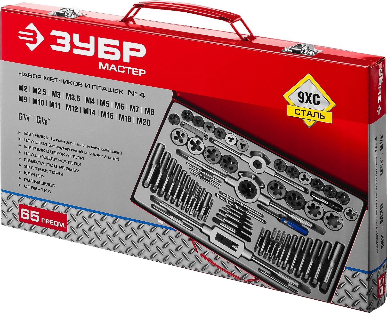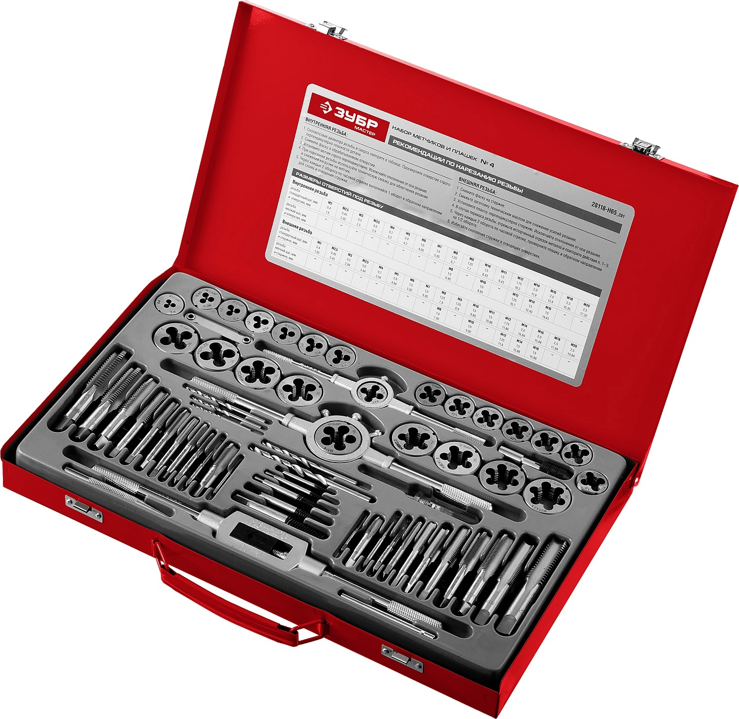 ПроизводителиНабор метчиков и плашек М2-М20, 65пр., 9ХС "МАСТЕР" (28118-H65_z01) ЗУБР