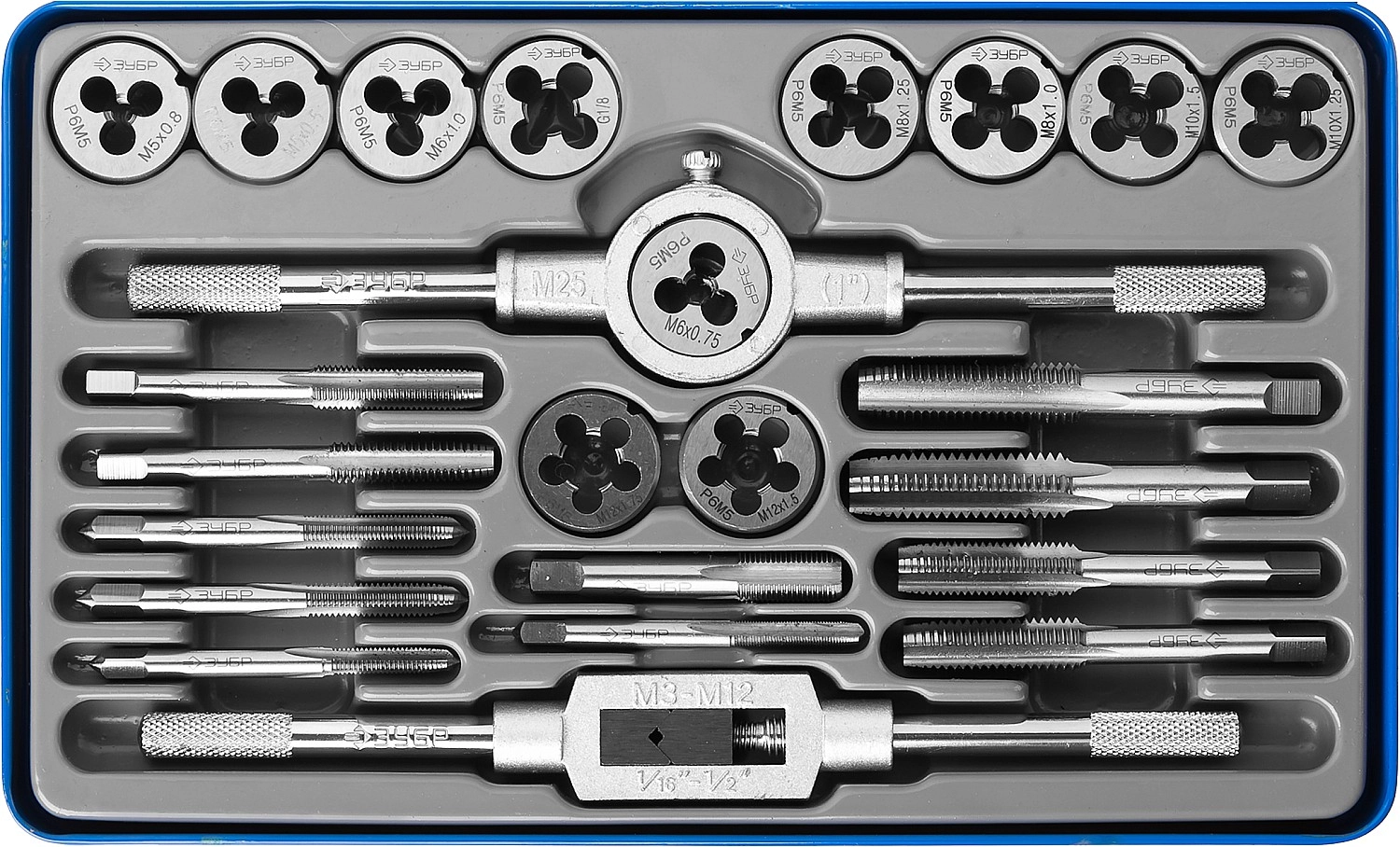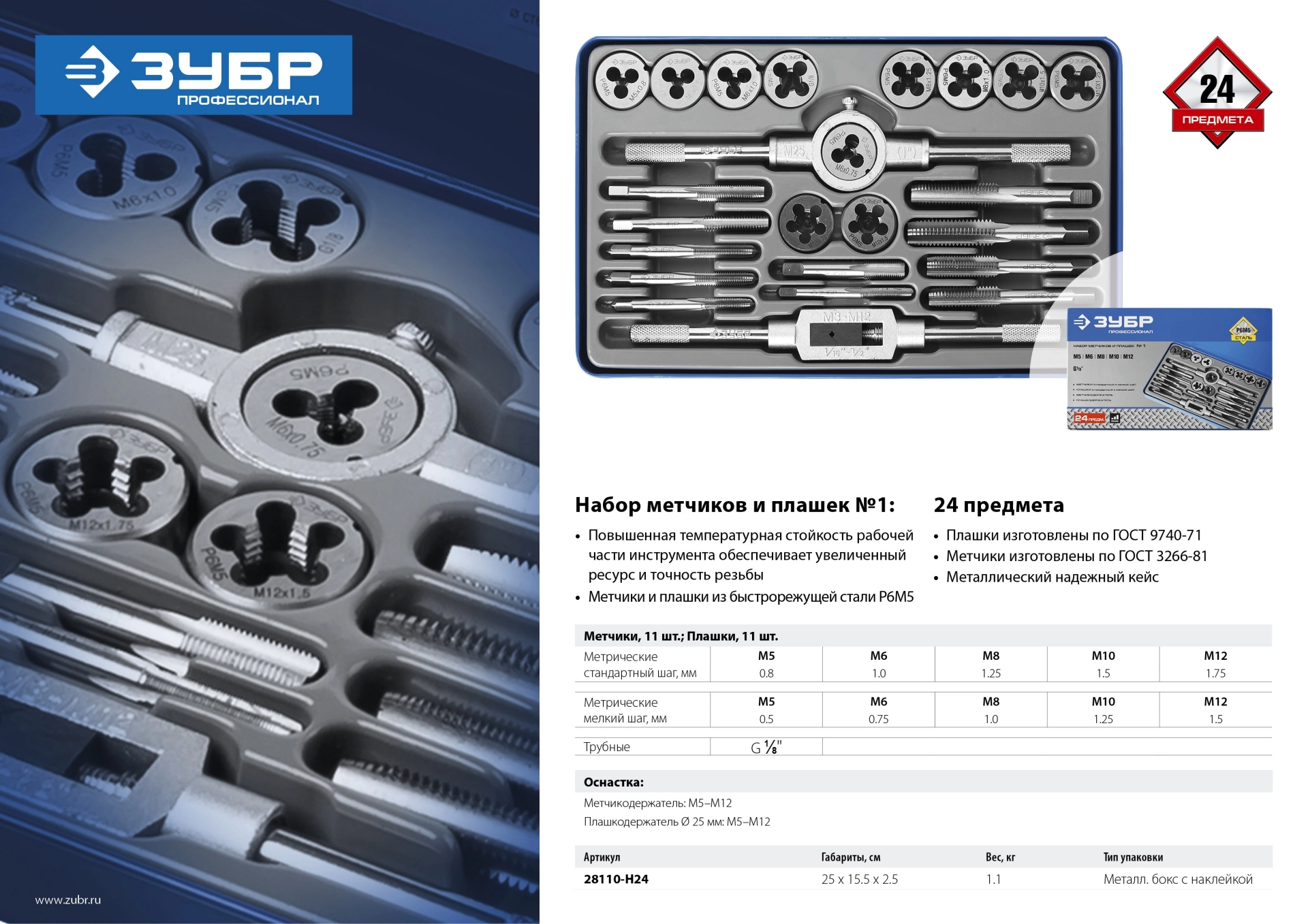 ПроизводителиНабор метчиков и плашек М5-М12, 24пр., Р6М5 "ПРОФЕССИОНАЛ" (28110-H24) ЗУБР