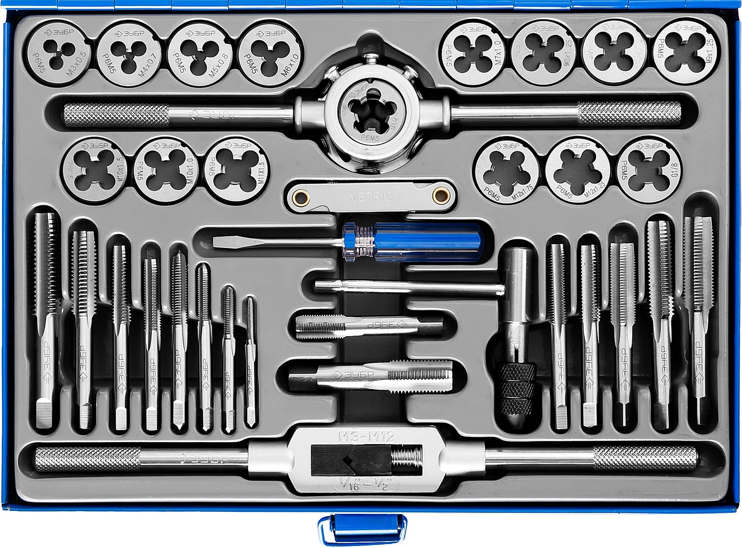 ПроизводителиНабор метчиков и плашек М6-М12, 35пр., Р6М5 "ПРОФЕССИОНАЛ" (28110-H35) ЗУБР