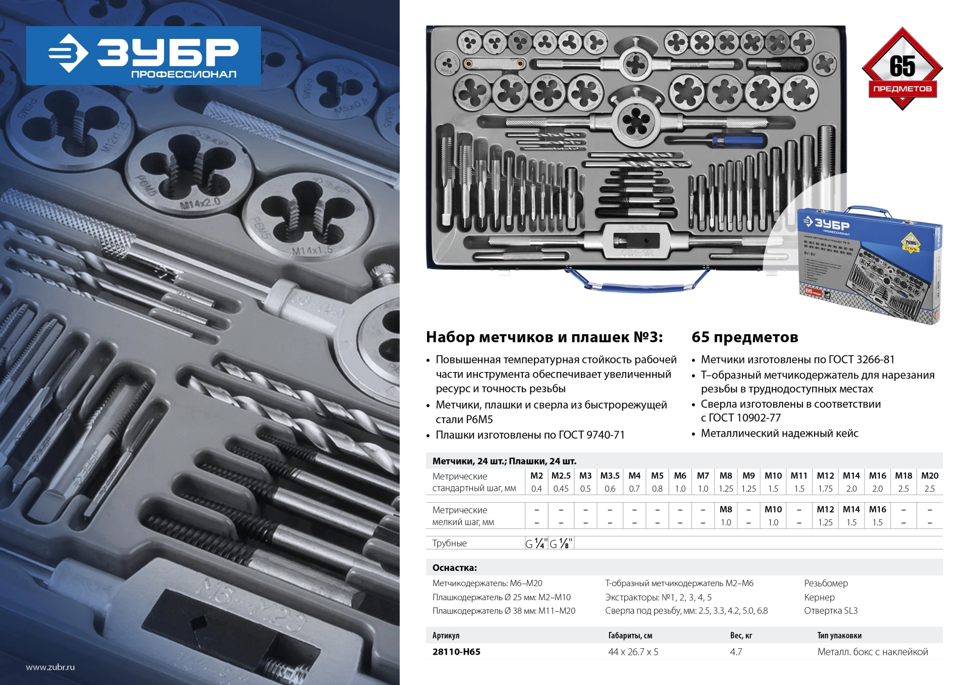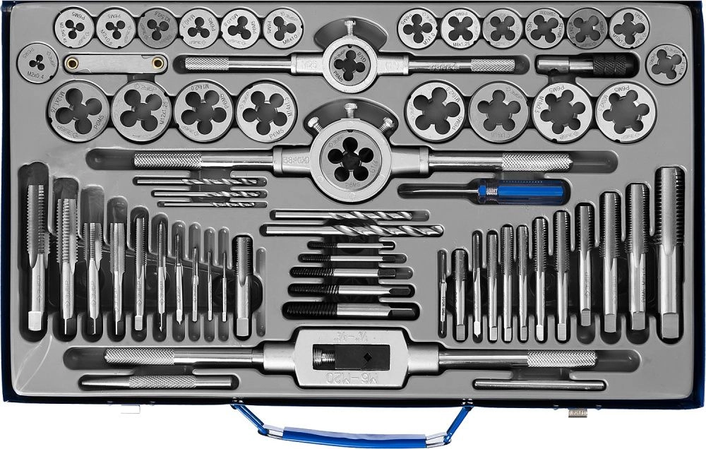 ПроизводителиНабор метчиков и плашек М6-М20, 65пр., Р6М5 "ПРОФЕССИОНАЛ" (28110-H65) ЗУБР