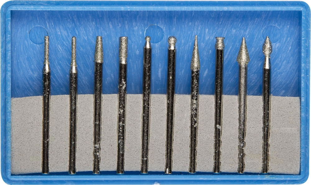 ПроизводителиНабор ЗУБР: Мини-насадки с алмазным напылением в пластиковом боксе, P=180, хвостовик d=3мм, 10 предм