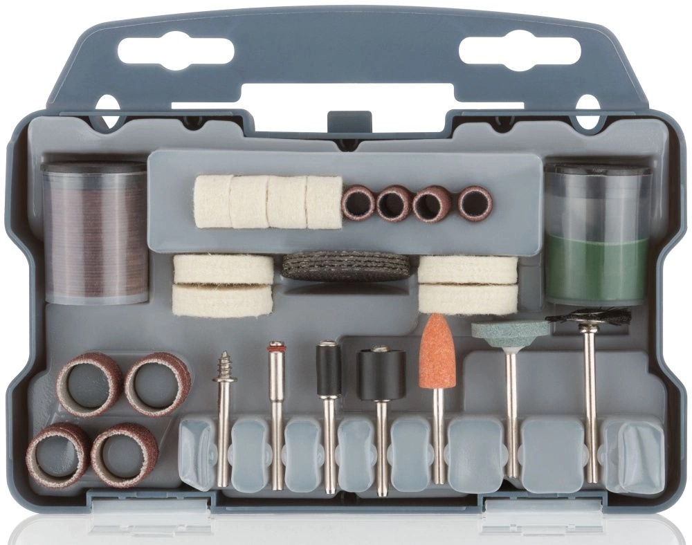Для гравировальной машины. Для обработки различных материалов. В наборе: трубки наждачные, круги войлочные, насадки войлочные, круги отрезные, шарошки абразивные, шарошки алмазные, корщетки нейлоновые, паста полировальная, патроны цанговые, держатели для полировальных насадок и наждачных трубок. Упаковка: пластиковая коробка.Производитель: