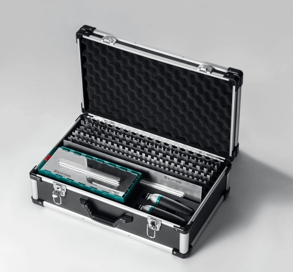 Набор гладилок - универсальный набор инструментов для плиточных и отделочных работ любого объема и сложности. Комплект из 12 лезвий предназначен для плитки всех размеров, а также как для труднодоступных участков работы, так и для внушительных объемов работ. Лезвия из нержавеющей стали толщиной в 0,7мм долговечны и легко очищаются. Ручки меняют свое положение на лезвии, для нужного Вам хвата. Кейс позволяет удобно хранить и транспортировать весь набор.