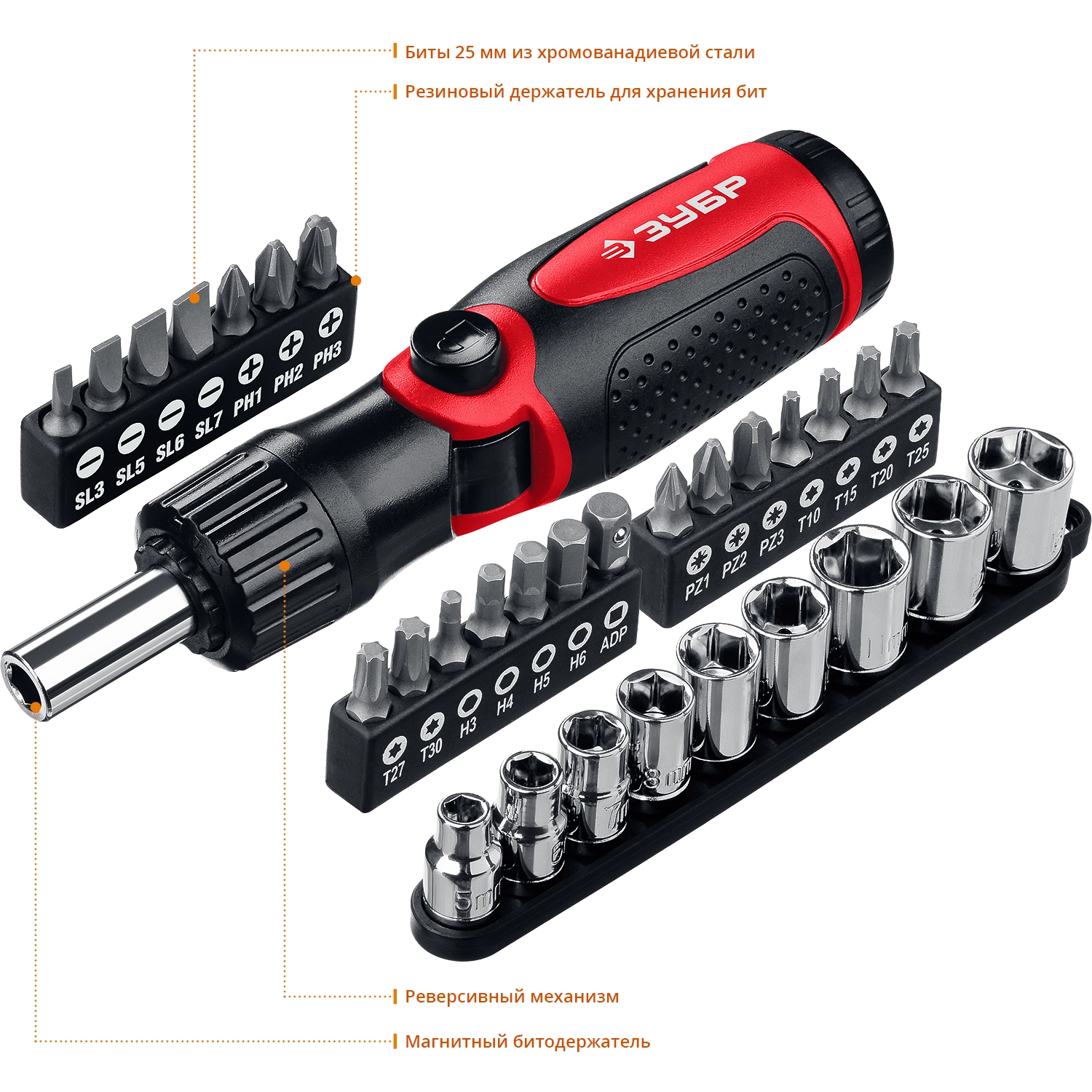 ПроизводителиНабор: Отвертка реверсивно-рычажная "МВ-31", ЗУБР Мастер 25161-H31, с битами и торцовыми головками,