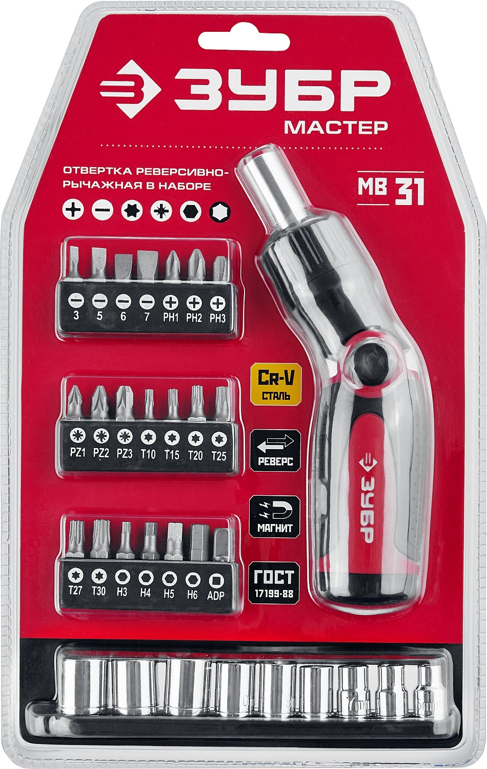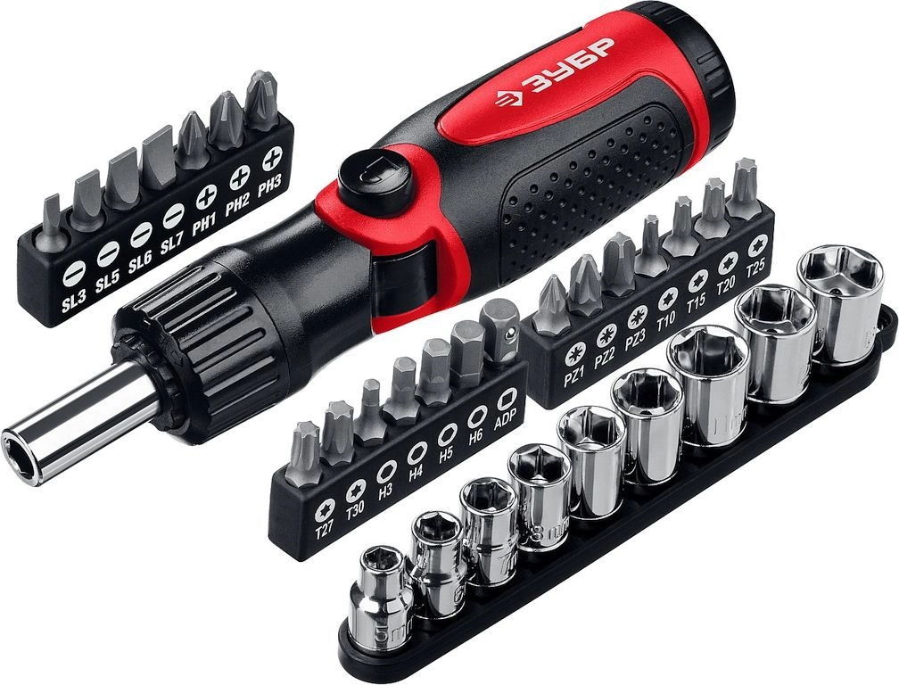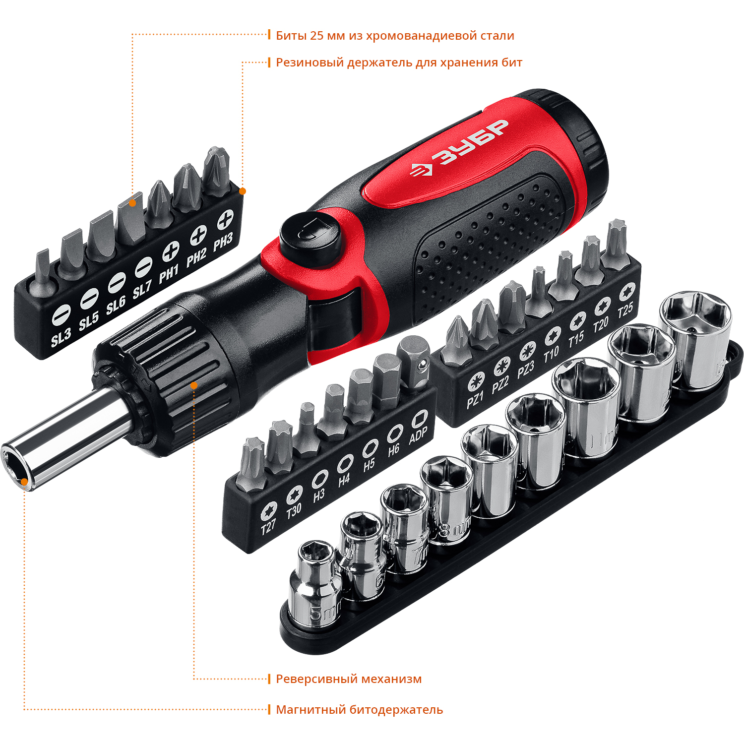 ПроизводителиНабор: Отвертка реверсивно-рычажная "МВ-31", ЗУБР Мастер 25161-H31, с битами и торцовыми головками,