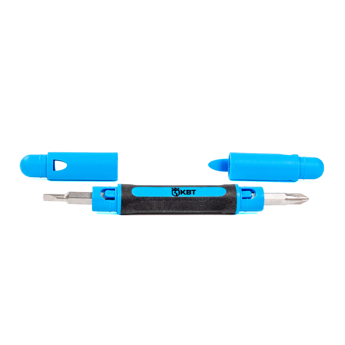 Отвертка-рукоятка в комплекте с двухсторонниими сменными битами НБ-4, 4 предмета, серия «МАСТЕР», КВТ 78697 — карманная отвертка со сменными битами 4-в-1. Применяется для работ, не требующих больших усилий. Двухсторонние биты установлены в рукоятке под защитными колпачками