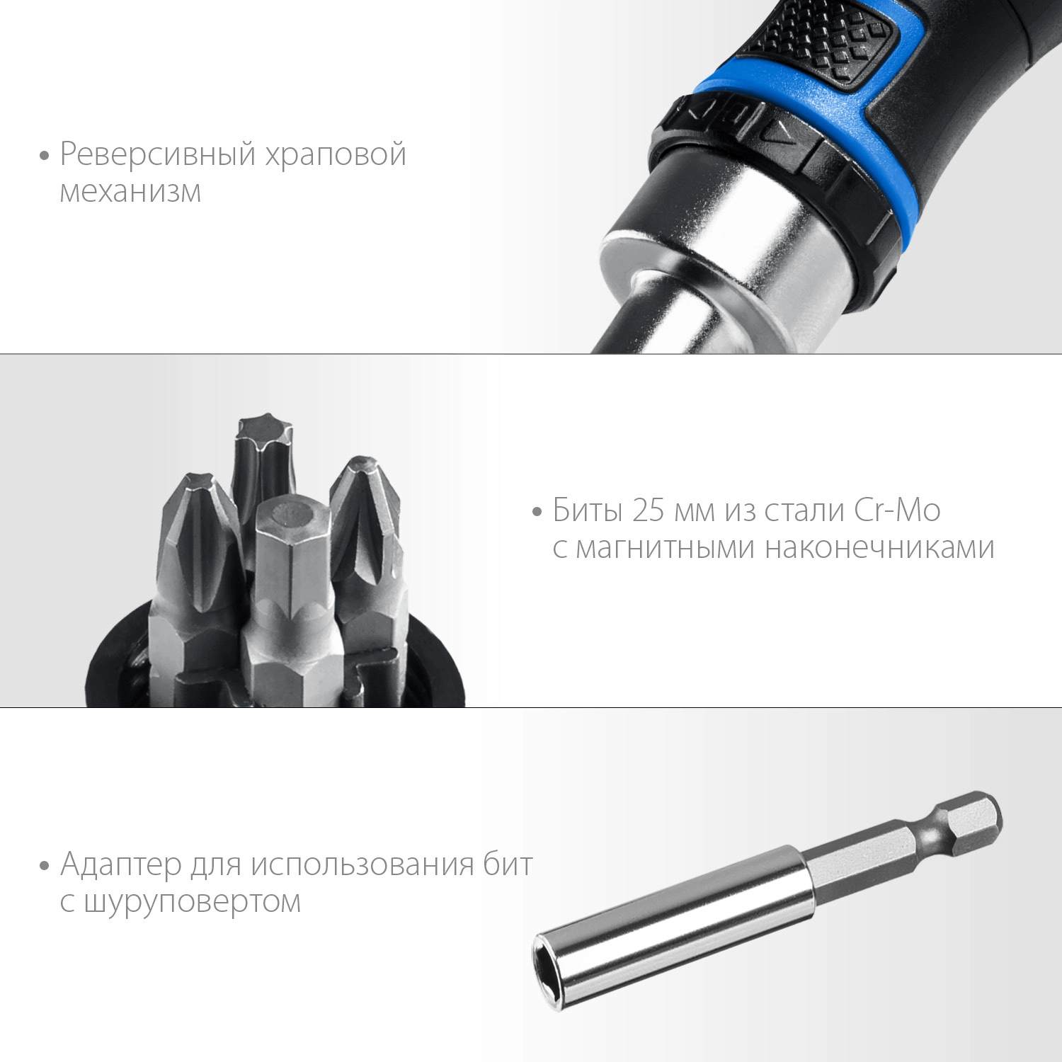 Отвертка оснащена реверсивным храповым механизмом, Направление вращения меняется одной рукой