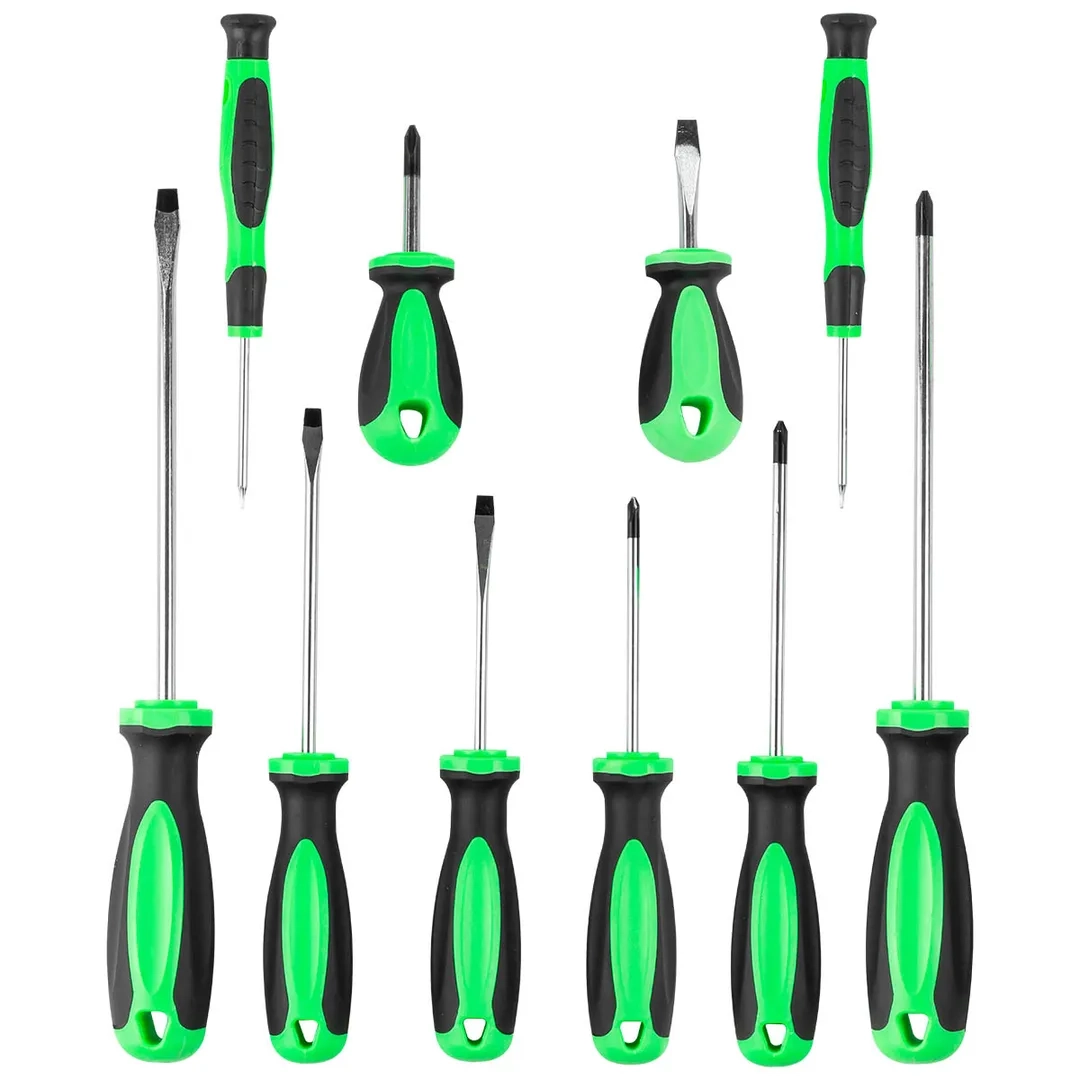 Набор отверток 10 предметов, в блистере - это ручной слесарный и столярный монтажный инструмент, предназначенный для завинчивания и отвинчивания крепёжных изделий с резьбой. Набор включает в себя 10 отверток трех видов: с прямым шлицем SL5,6 х 40мм, SL4,5 х 100мм, SL3,8 х 75мм, SL5,6 х 150мм, крестообразным шлицем PH2 х 150мм, PH1 х 100мм, PH2 х 40мм, PH0 х 75мм и Torx Т5 х 50мм, Т4 х 50мм, что делает набор универсальным для различных задач. Стержни отвертки изготовлены из высококачественной стали, которая обеспечивает высокую прочность и устойчивость к износу. Отвертки оснащены мощным магнитным наконечником, который позволяет легко и быстро находить и удерживать крепеж. Ручки отверток имеют удобную эргономичную форму, которая обеспечивает комфортное использование и не утомляет руку при длительном использовании. Набор отверток полезны при ремонте и сборке мебели, техники, автомобилей и других устройств, где требуется работа с винтами и болтами.Производитель: