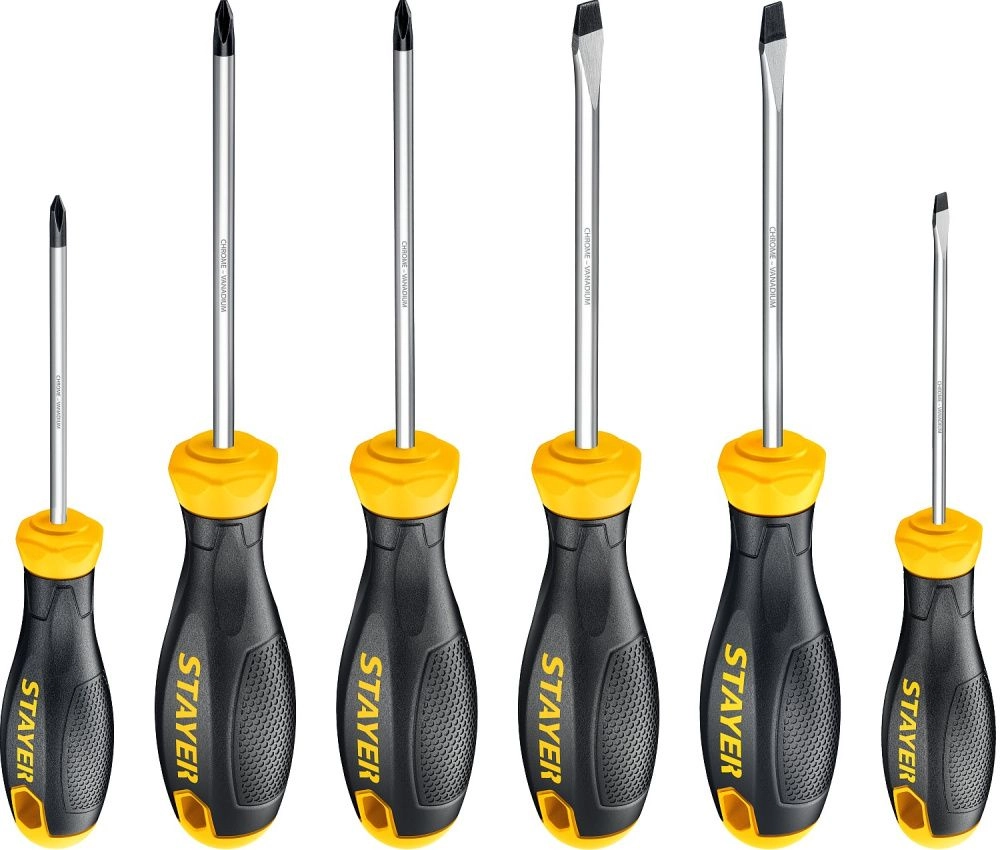 Набор отверток STAYER 2513-H6_z02, предназначен для монтажа и демонтажа резьбовых соединений. Материал стержня - сталь Cr-V. Высокая твердость и точность шлица. Магнитный наконечник помогает при работе в труднодоступных местах. Специально сконструированная двухкомпонентная рукоятка оптимальной формы обеспечивает надежный и комфортный захват.