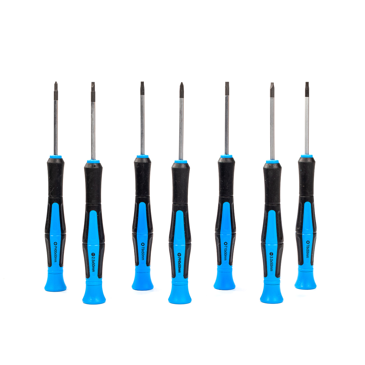 Состав набора: 2 отвертки шлиц: SL 2.5 х 50; SL 3.0 х 50; 2 крестовых отвертки: PH 00 х 50; PH 0 х 50; 3 отвертки Torx: TX 8 х 50; TX 9 х 50; TX 10 х 50.