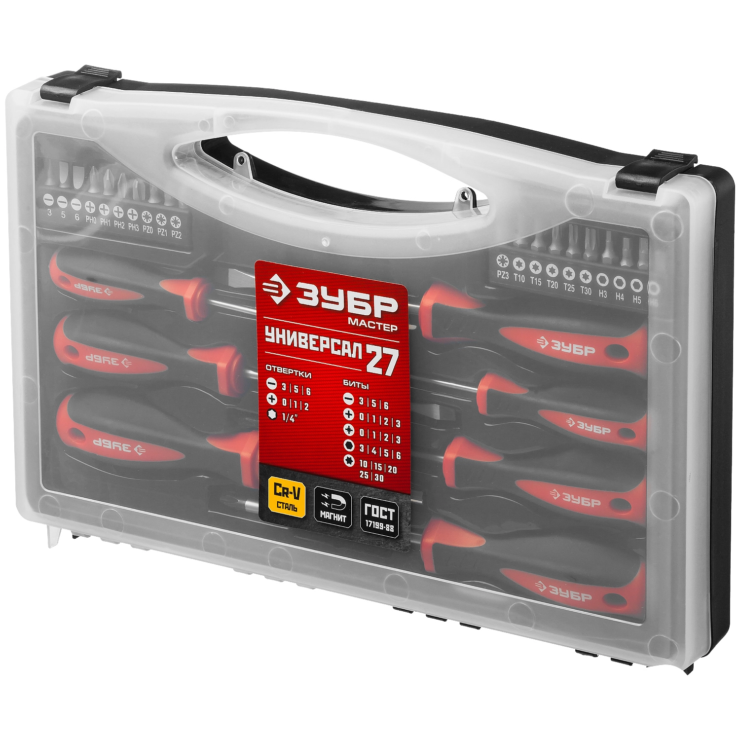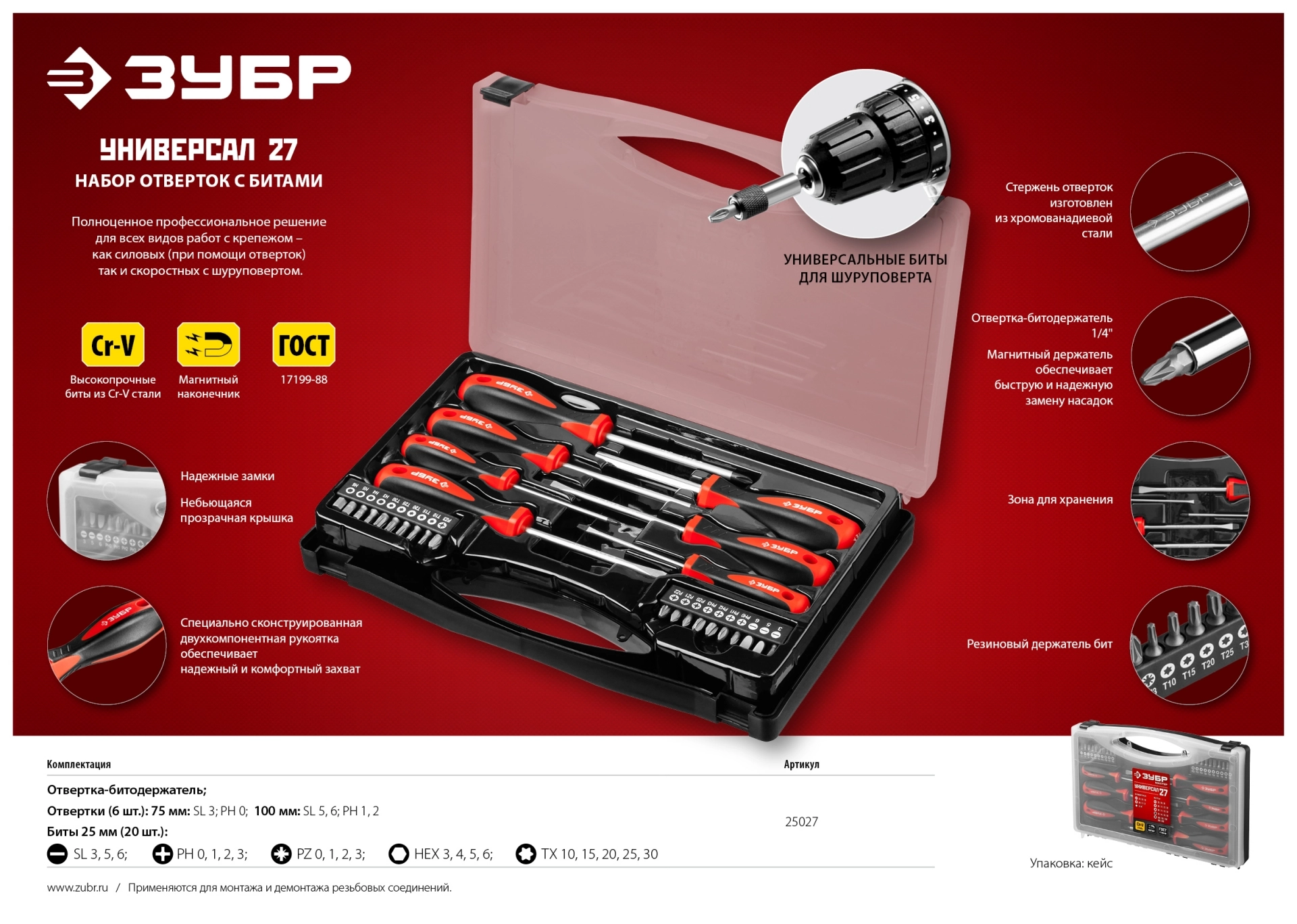 ПроизводителиНабор отвертки с битами, двухкомп. рук., Cr-V "Универсал 27""МАСТЕР" (25027) ЗУБР