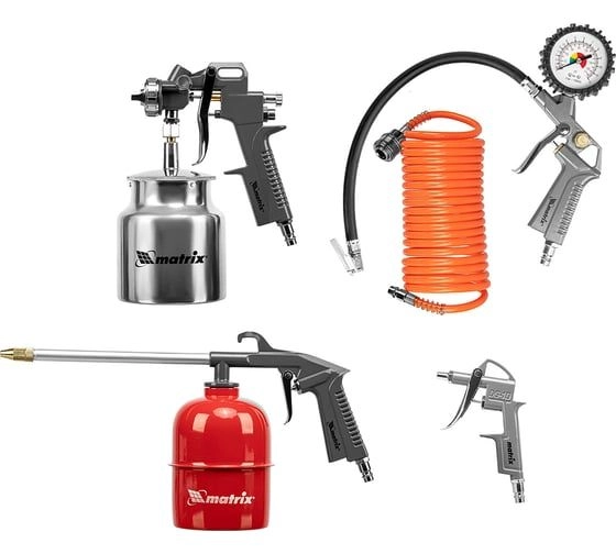 Набор пневмоинструмента MATRIX 57302 включает в себя 5 предметов. Он предназначен для покрасочных, промывочных, продувочных работ, а также для подкачки шин. Применяется в гаражах, домашних мастерских, автосервисах, на мебельном производстве, при мелких посадочных работах. Подходит ко всем видам пневматических компрессоров.Производитель: ООО "Мир инструмента", Россия