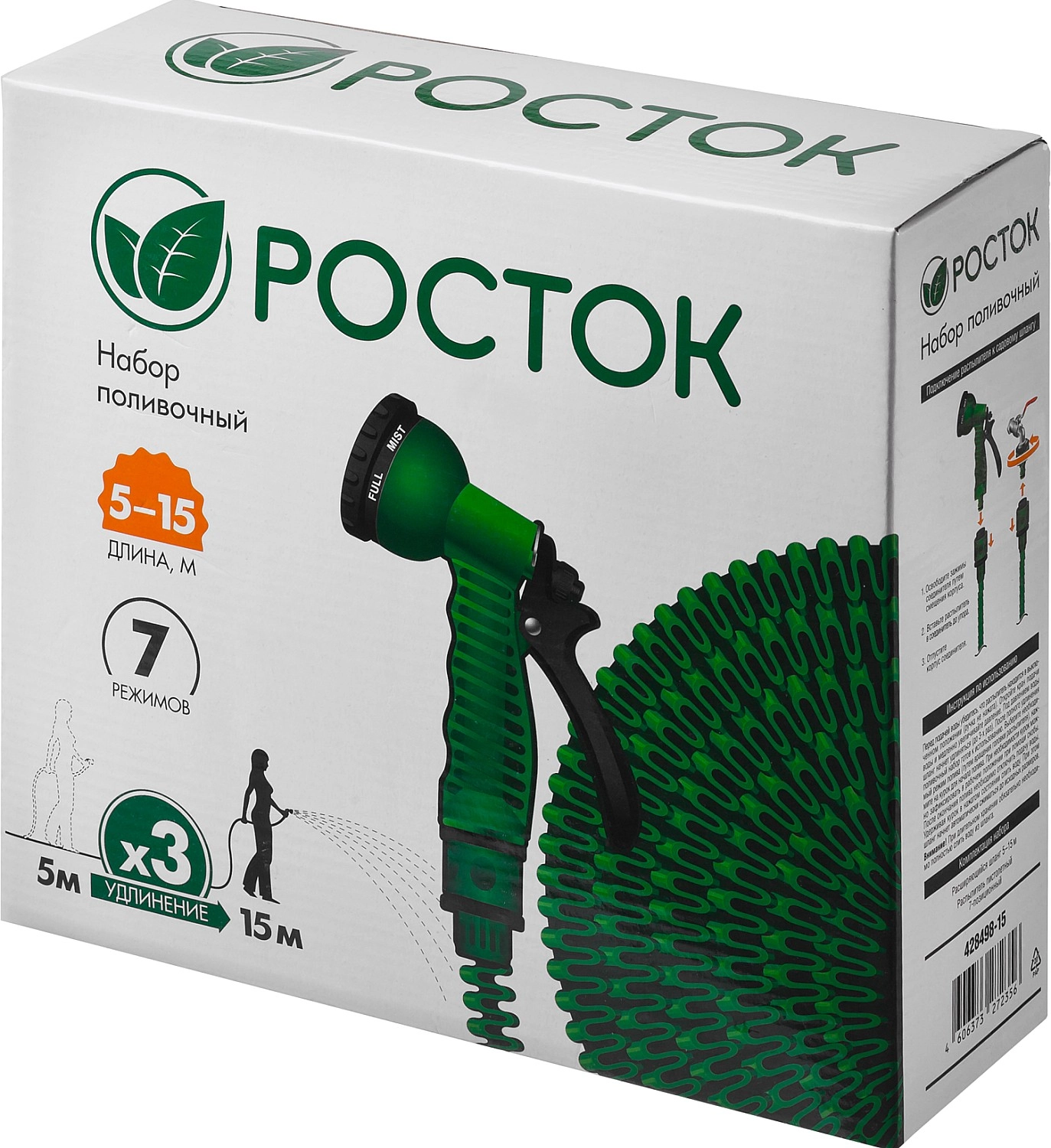 ПроизводителиНабор поливочный: Шланг 15 м, распылитель пистол., адаптер внеш. 1/2" (428498-15) РОСТОК