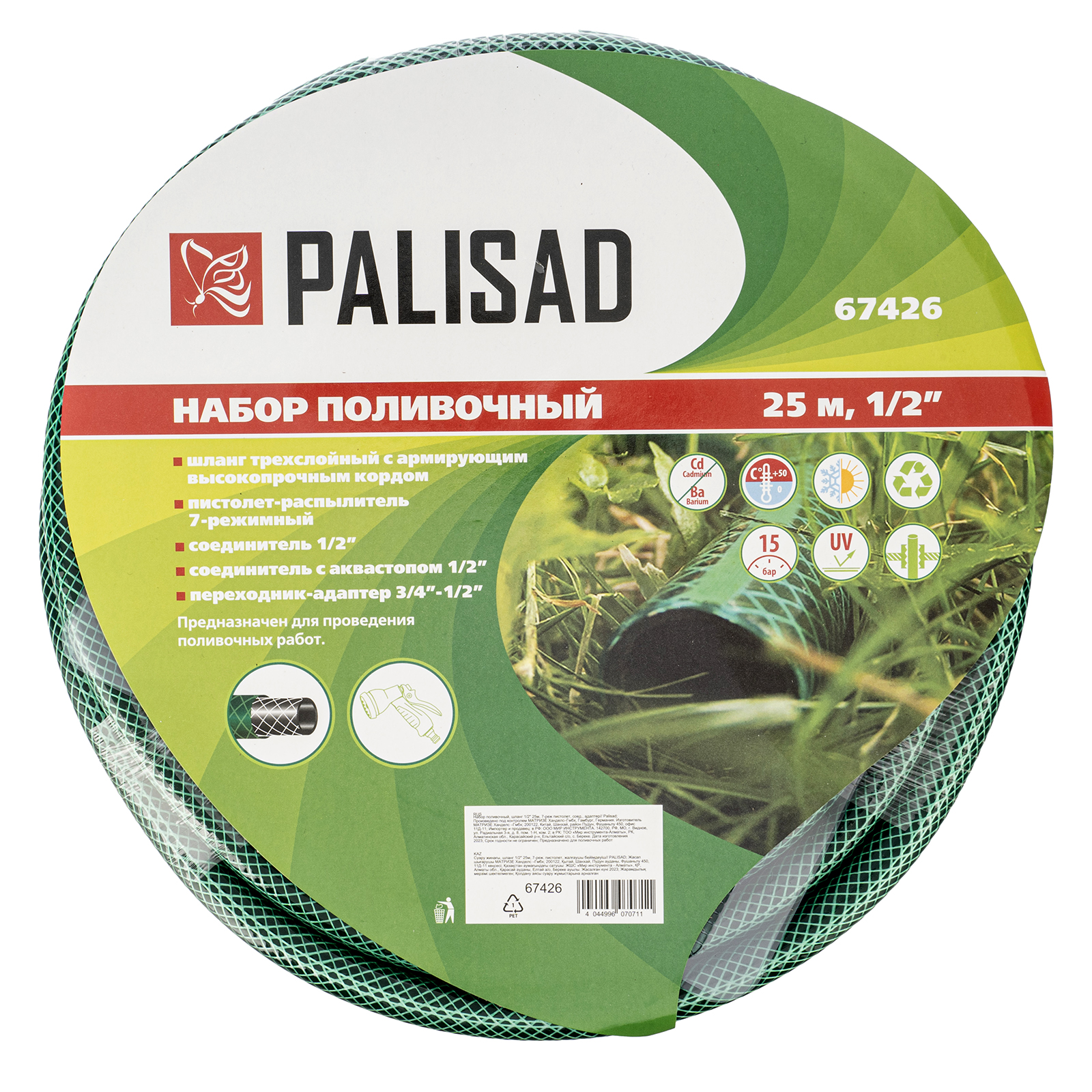 ПроизводителиНабор поливочный, шланг 1/2" 25м, 7-реж пистолет, соед., адаптер (67426) PALISAD