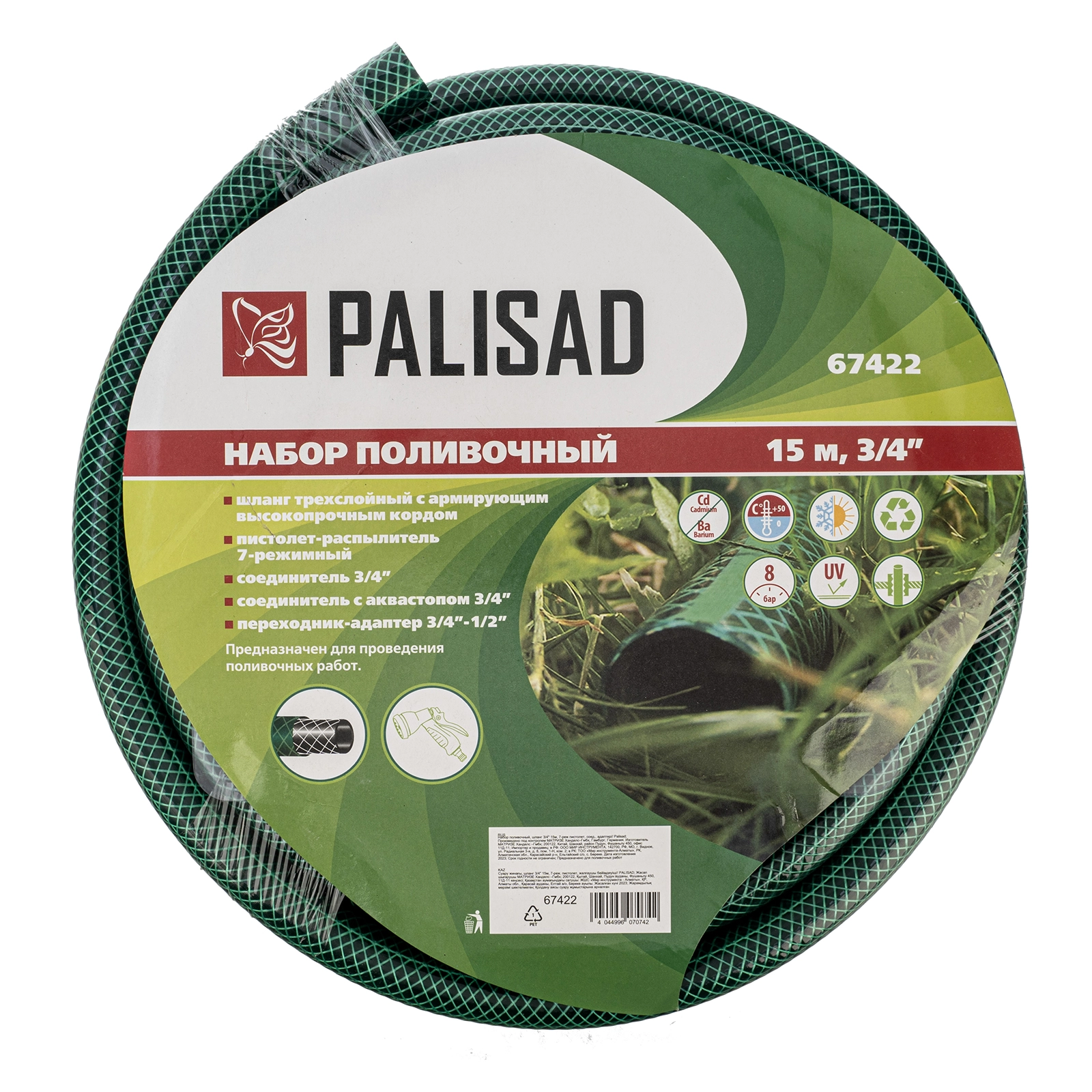 ПроизводителиНабор поливочный, шланг 3/4" 15м, 7-реж пистолет, соед., адаптер (67422) PALISAD