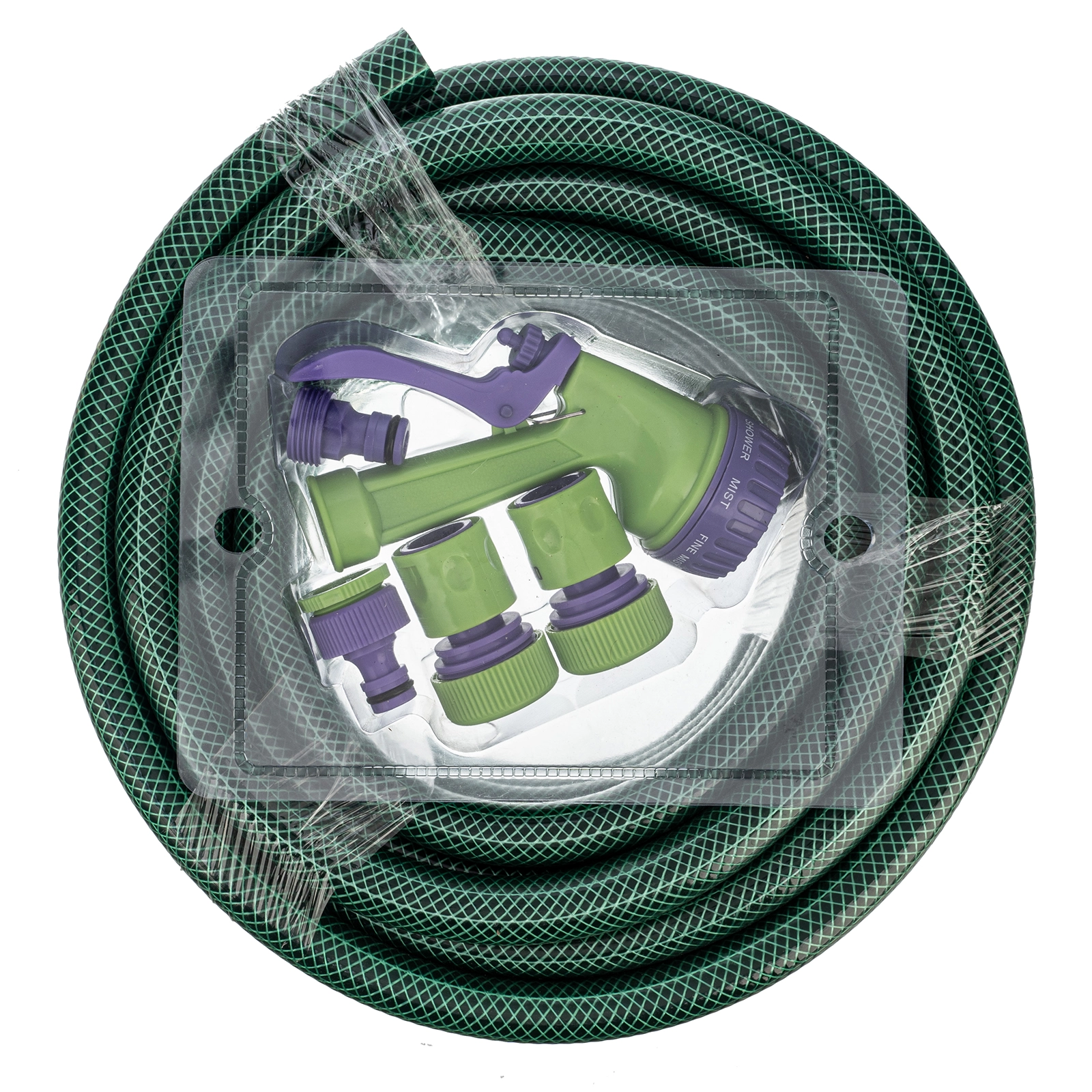 Поливочный набор Palisad 67422 состоит из шланга диаметром 3/4 дюйма и длиной 15 м, 7-режимного пистолета, соединителей и адаптера.